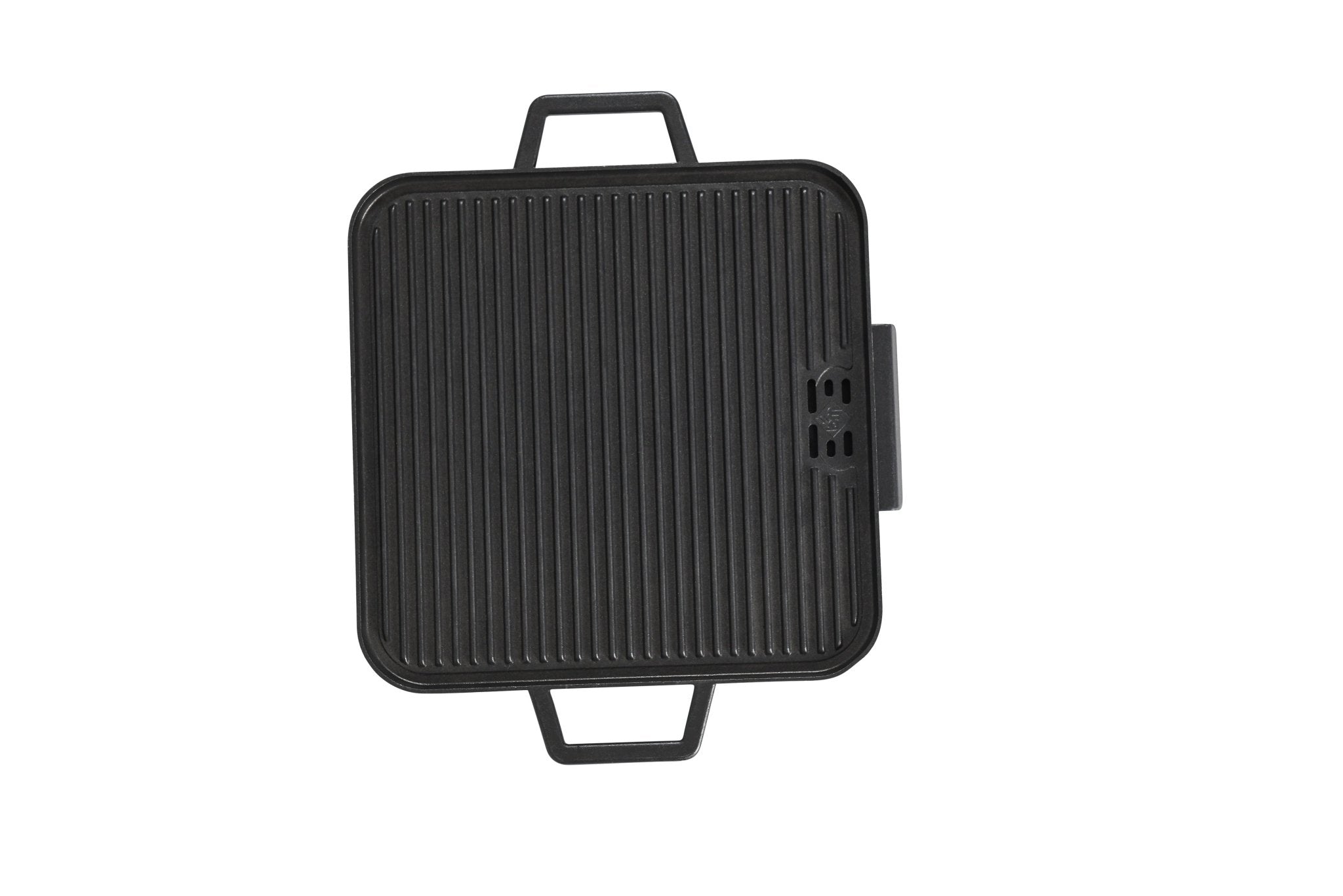 Cast iron griddle plate. The griddle plate features a grease drain that can be pulled out and cleaned using the drawer. Ribbed surface for grilling. Two handles on the side.
