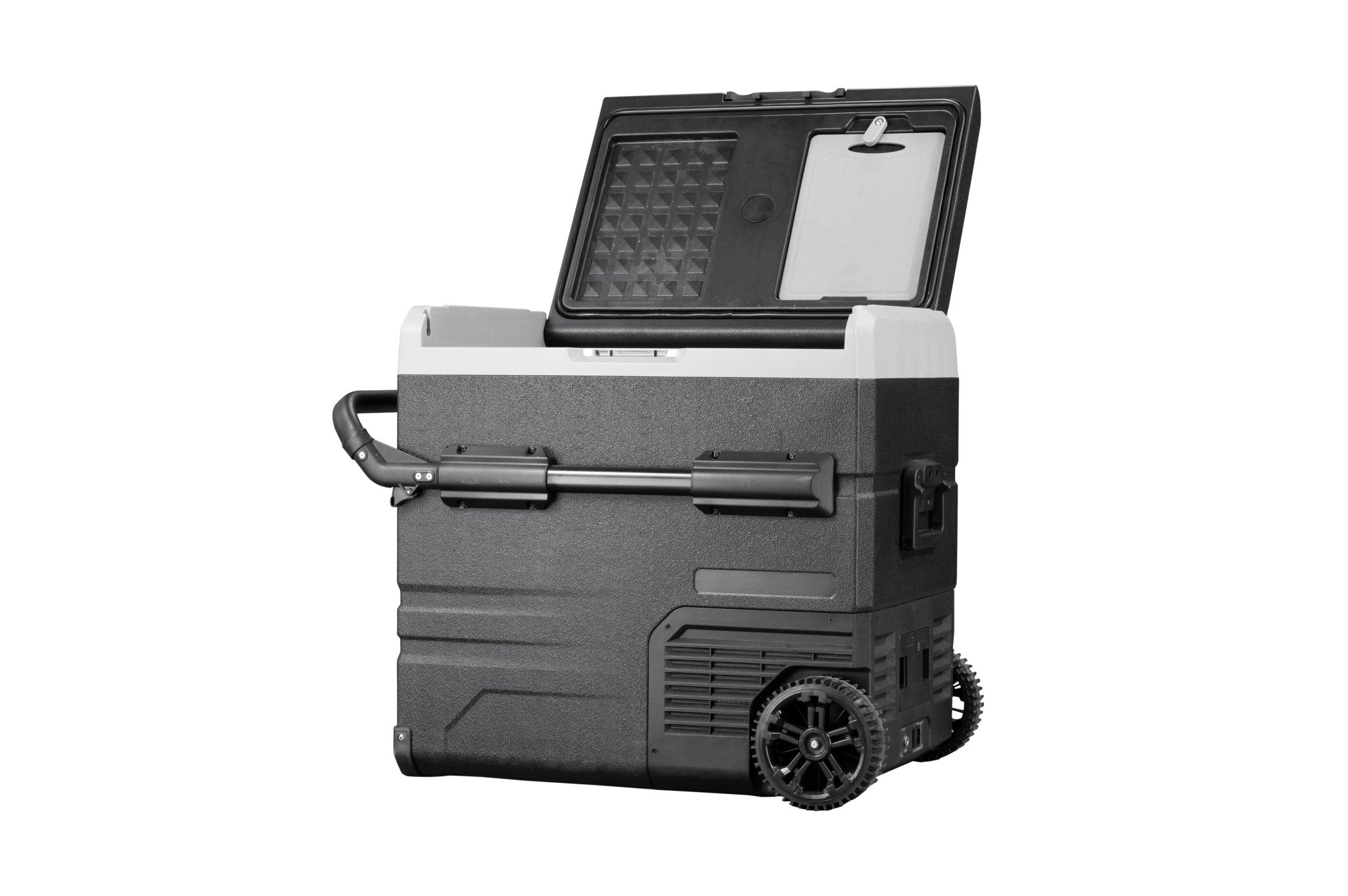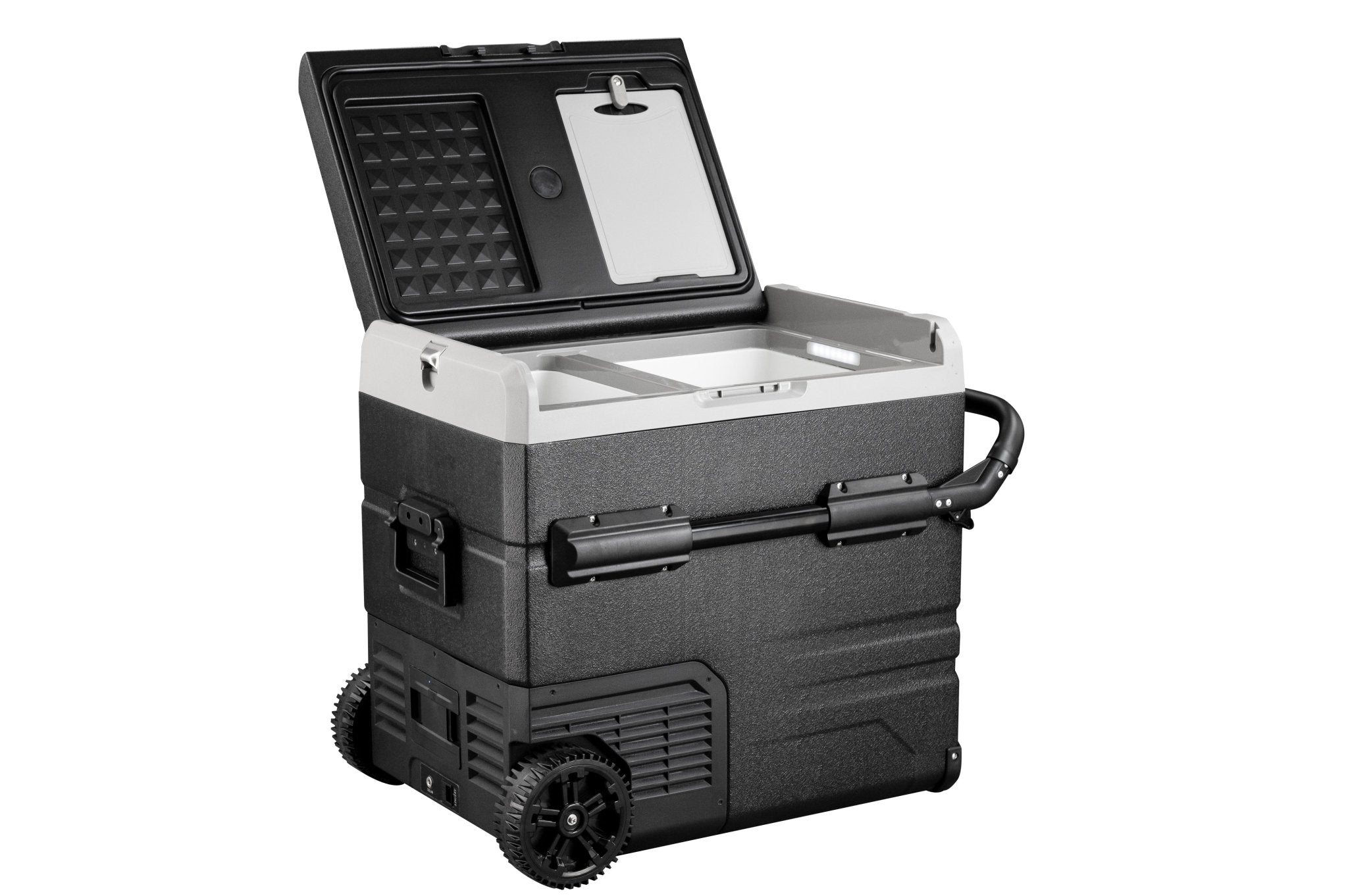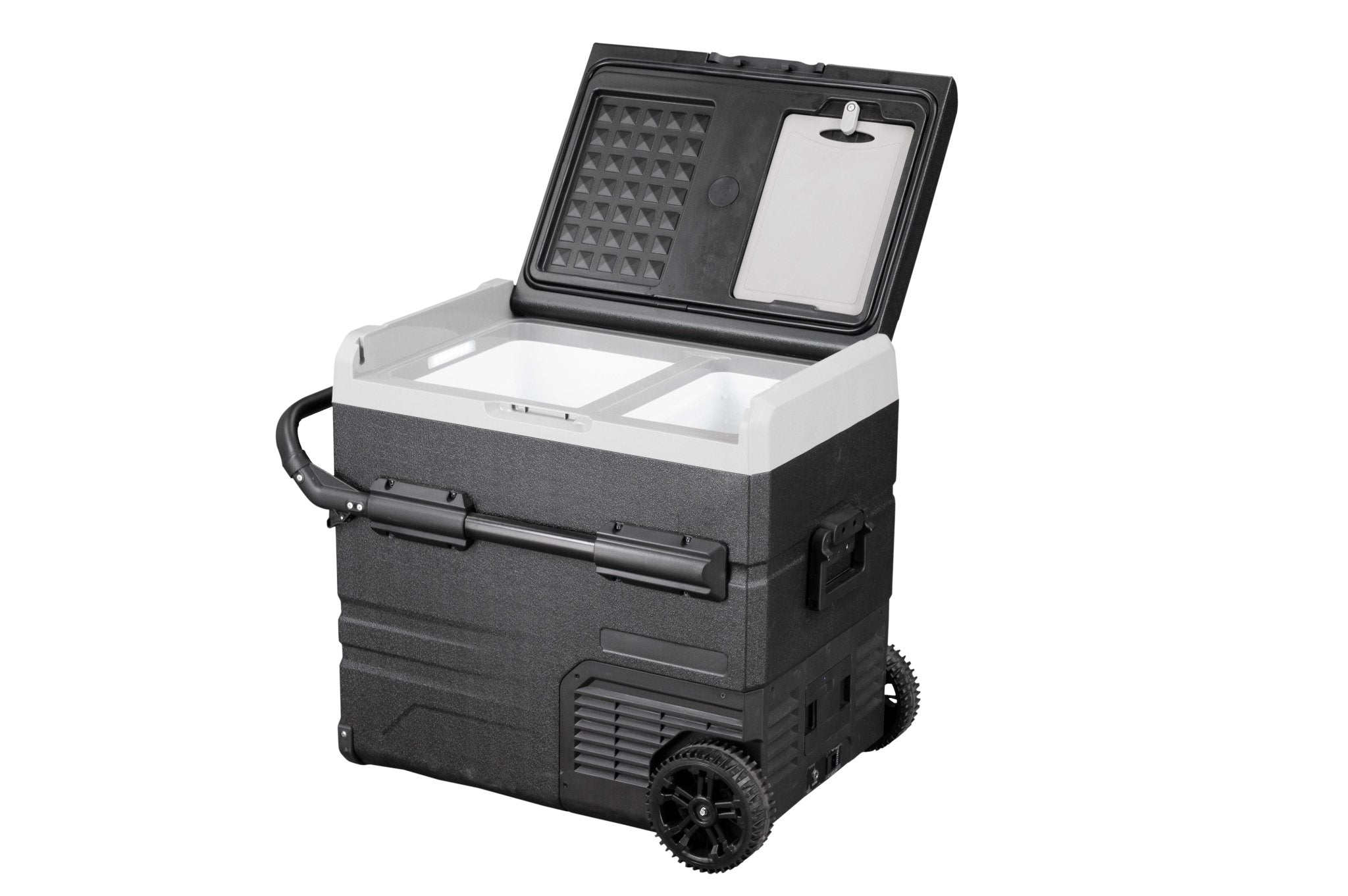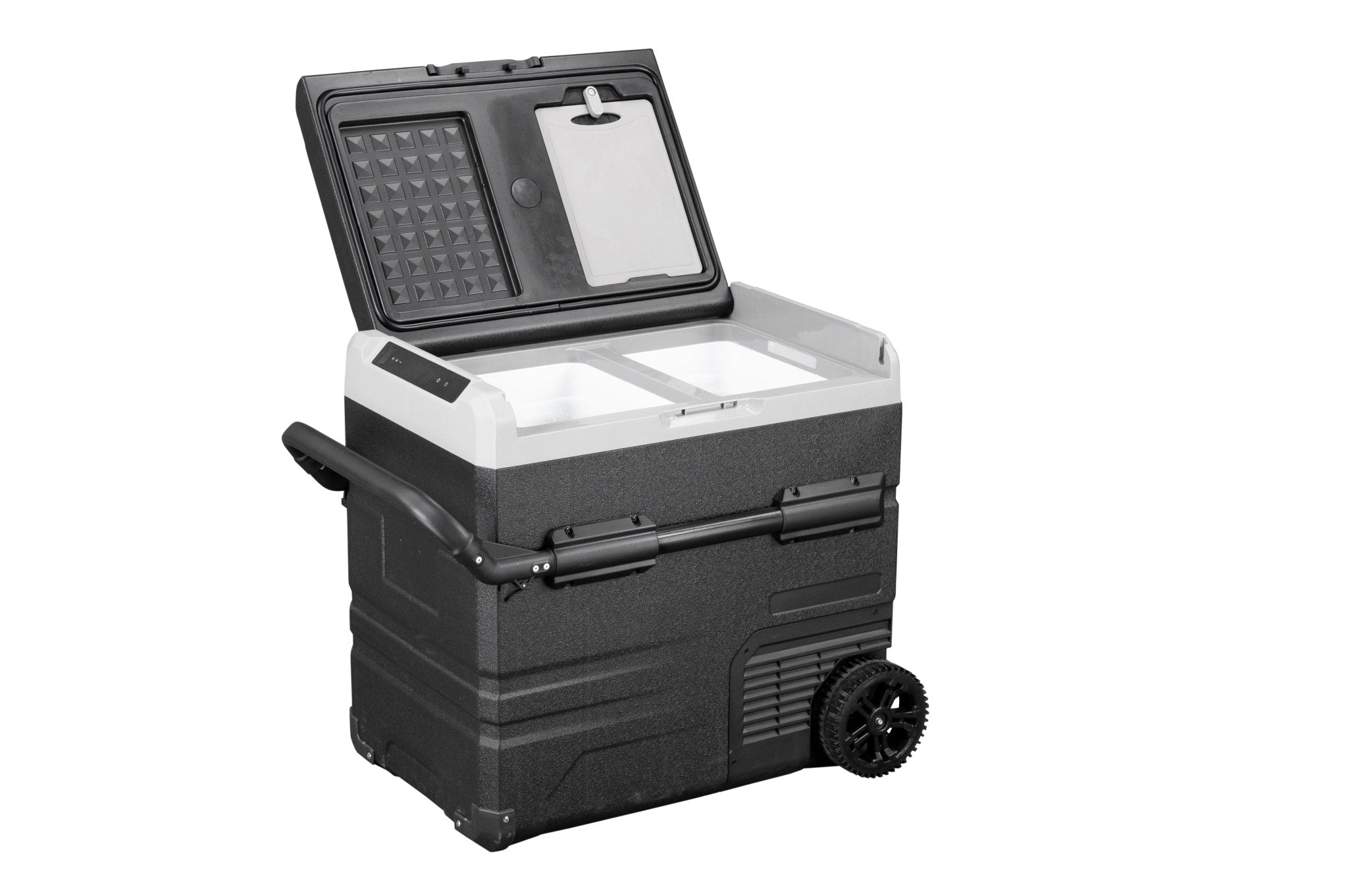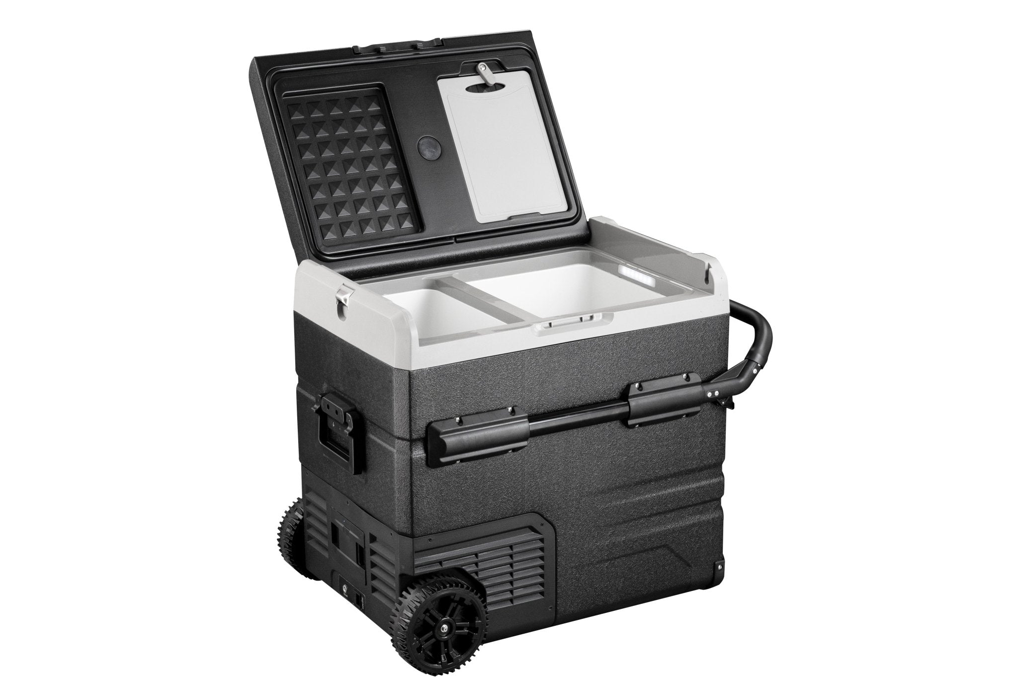 The Annjuk by Alpicool TWW55 portable car refrigerator with freezer compartment has a 55-liter capacity and is suitable for storing food and other items. The cooler can be powered by the included removable battery or via mains electricity. Thanks to its advanced cooling technology, the Annjuk by Alpicool TWW55 car refrigerator cools down to 0°C in no time. All coolers in the Annjuk by Alpicool T-series car refrigerators utilize advanced LG cooling technology (high-efficiency DC compressor and conversion module). With the freezer function, the cooler can even reach a frosty -20°C (based on an ambient temperature of 25°C). The compartment is divided into two sections, each with its own temperature setting. The compartments also include a wire mesh insert. Inside the cooler, LED lights automatically illuminate when the lid is opened. For more efficient performance, the cooling walls are fully insulated. The intelligent battery protection prevents the vehicle battery from running out. The cooler is CFC-free and comes with a DC12/24V or AC 100~240V (with appropriate adapter) power connection. Transport wheels, a folding handle on one side, and a telescopic handle on the other make moving and transporting the cooler easy. The TWW55 comes with an integrated cutting board and bottle opener, making it the perfect companion for outdoor adventures, camping trips, road trips, or picnics.