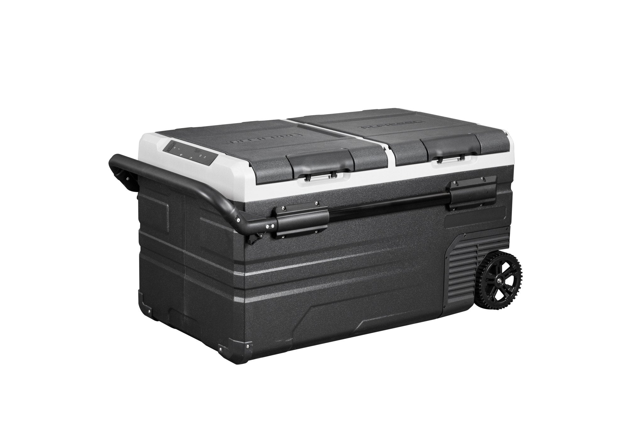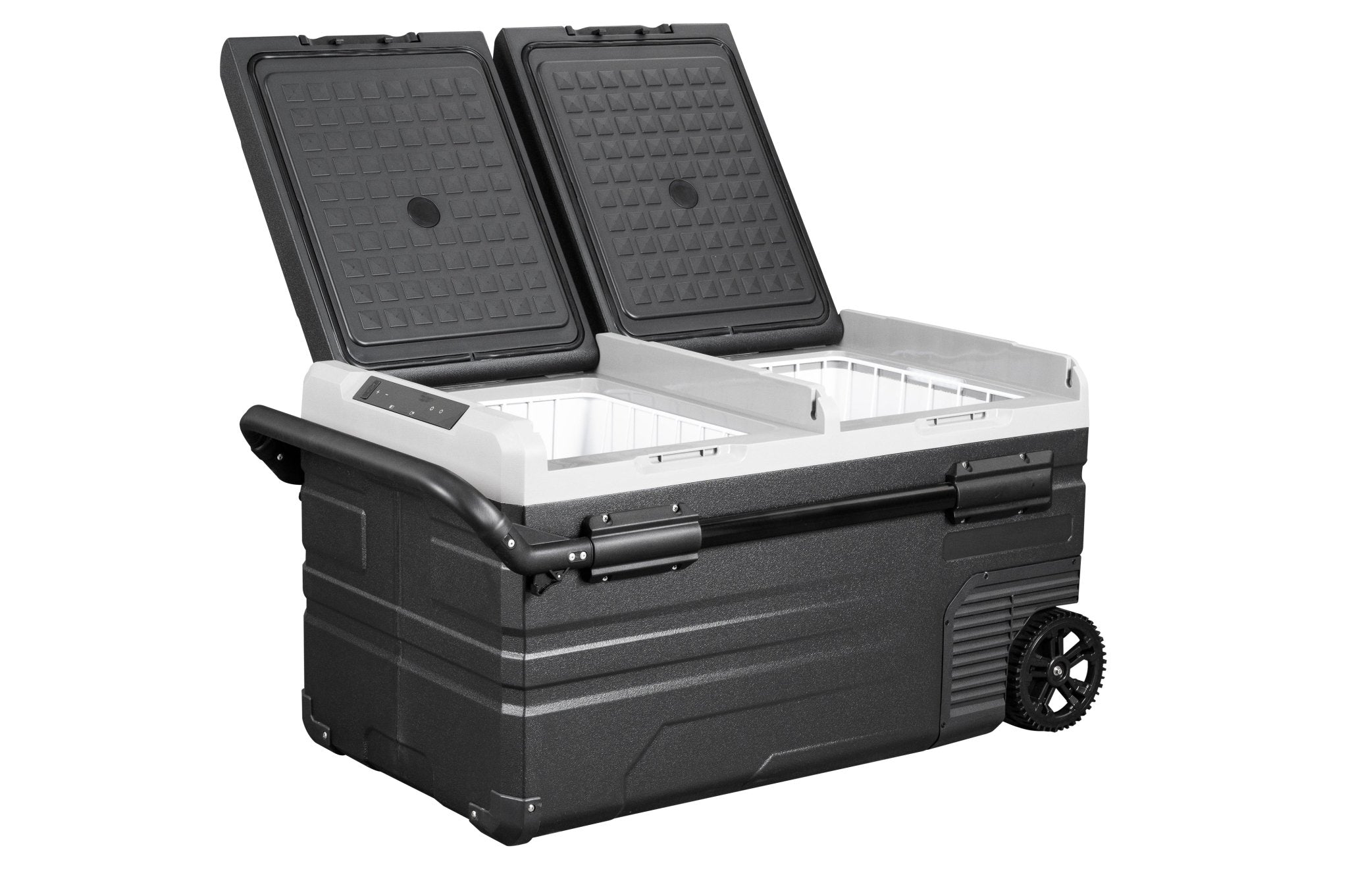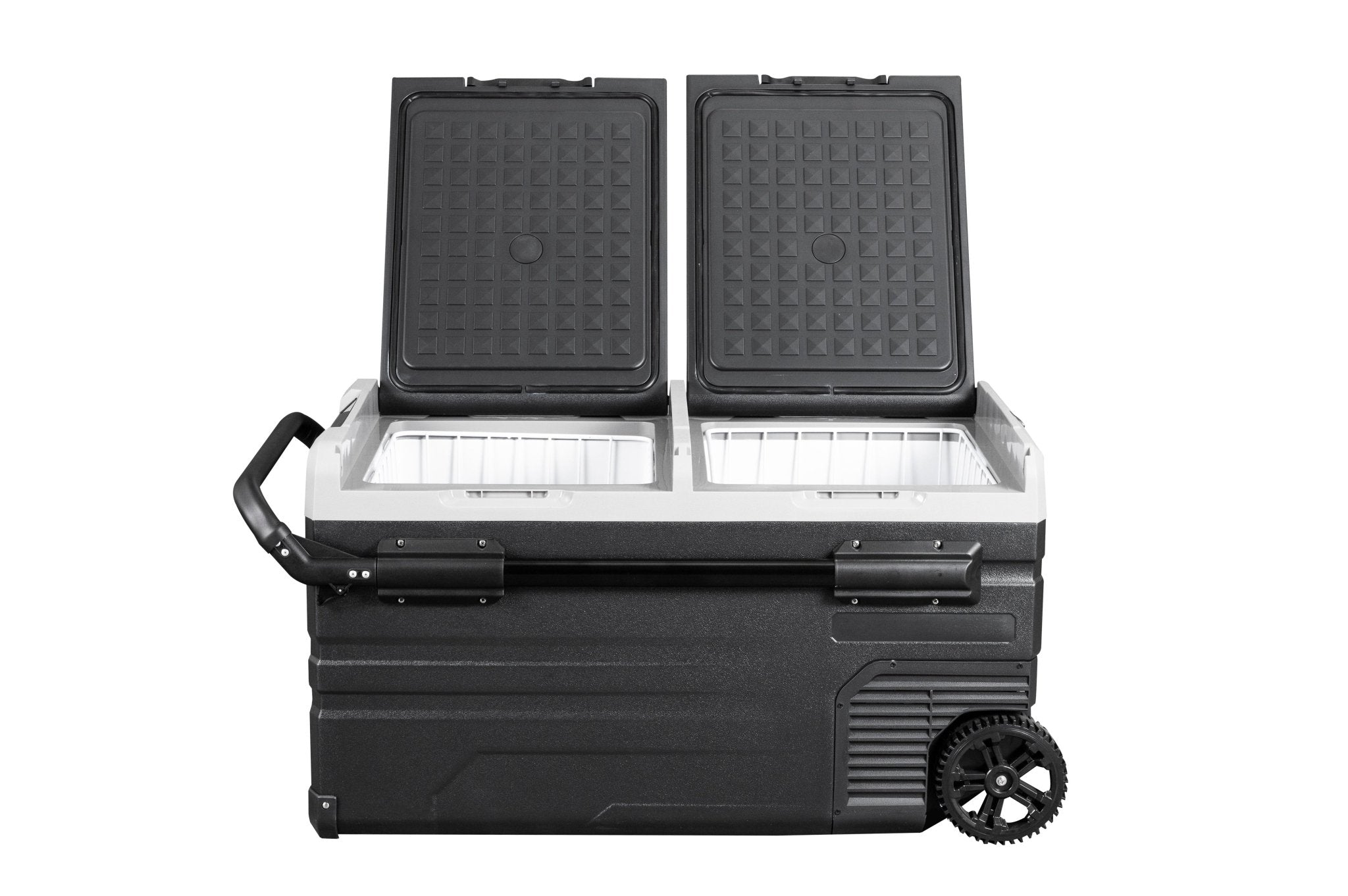 The Annjuk by Alpicool TWW75 portable car refrigerator with freezer compartment has a 75-liter capacity and is suitable for storing food and other items. Thanks to its advanced cooling technology, the Annjuk by Alpicool TWW75 car refrigerator cools down to 0°C in no time. All refrigerators in the Annjuk by Alpicool T-series utilize advanced LG cooling technology (high-efficiency DC compressor and conversion module). With the freezer function, the refrigerator can even reach a frosty -20°C (based on an ambient temperature of 25°C). The refrigerator is divided into two compartments, each with its own temperature setting. The compartments also include a wire mesh insert. Inside the refrigerator, LED lights automatically illuminate when the lid is opened. For more efficient performance, the cooling walls are fully insulated. Intelligent battery protection prevents the vehicle battery from being drained. The cooler is CFC-free and comes with a DC12/24V or AC 100~240V (with appropriate adapter) power connection. Transport wheels, a folding handle on one side, and a telescopic handle on the other make moving and transporting the cooler easy. The TWW75 comes with an integrated cutting board and bottle opener, making it the perfect companion for outdoor adventures, camping trips, road trips, or picnics.