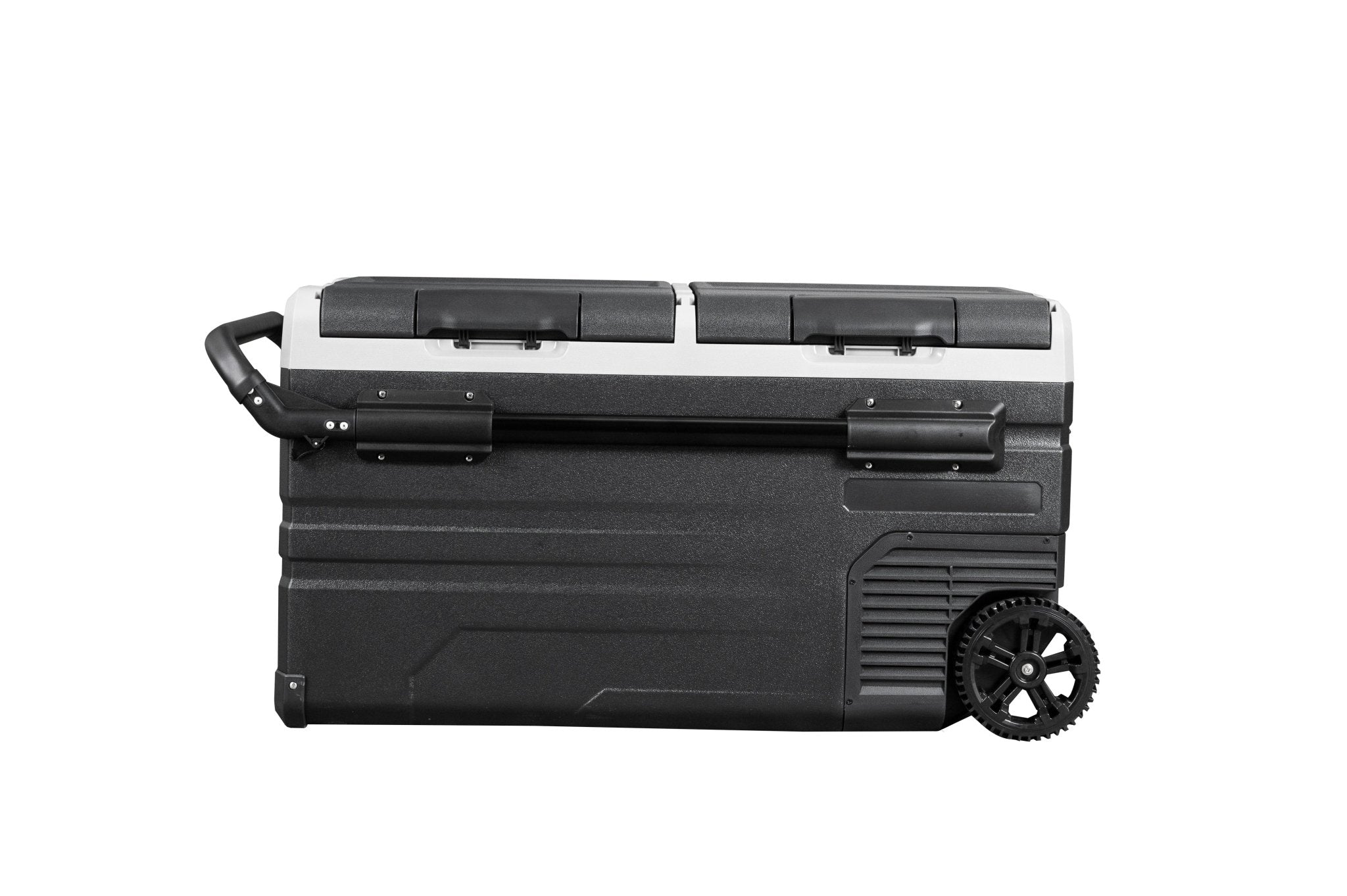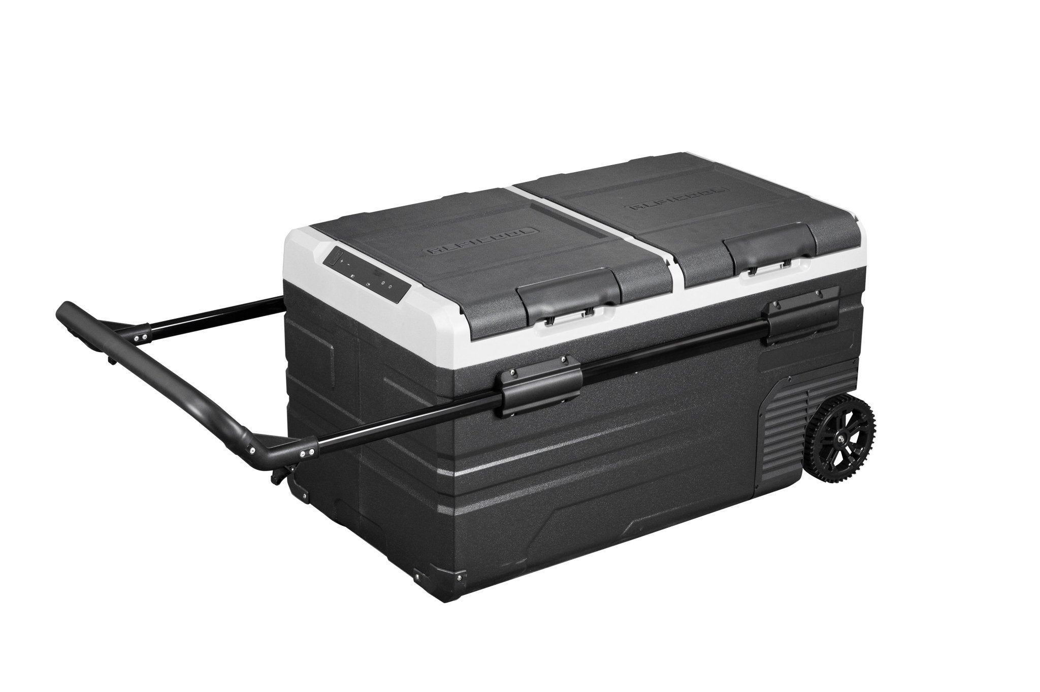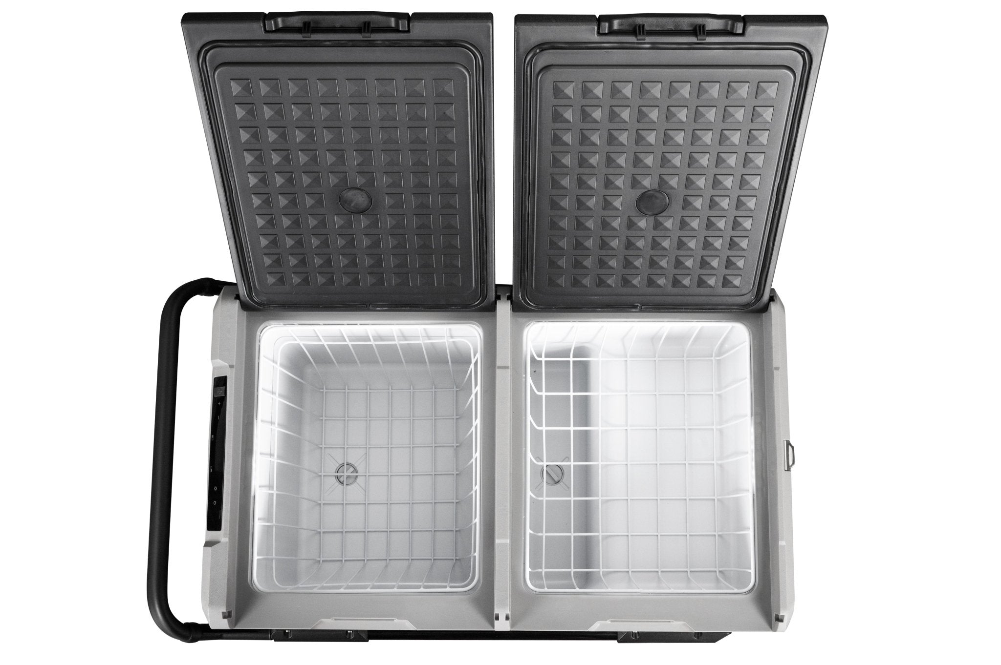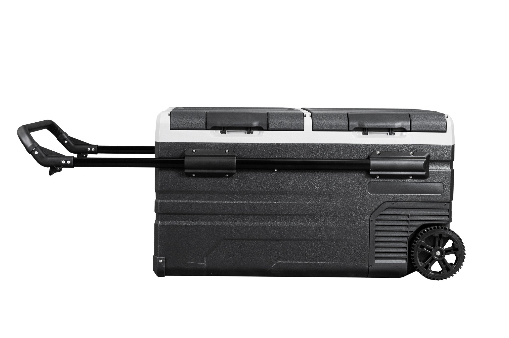 The Annjuk by Alpicool TWW75 portable car refrigerator with freezer compartment has a 75-liter capacity and is suitable for storing food and other items. Thanks to its advanced cooling technology, the Annjuk by Alpicool TWW75 car refrigerator cools down to 0°C in no time. All refrigerators in the Annjuk by Alpicool T-series utilize advanced LG cooling technology (high-efficiency DC compressor and conversion module). With the freezer function, the refrigerator can even reach a frosty -20°C (based on an ambient temperature of 25°C). The refrigerator is divided into two compartments, each with its own temperature setting. The compartments also include a wire mesh insert. Inside the refrigerator, LED lights automatically illuminate when the lid is opened. For more efficient performance, the cooling walls are fully insulated. Intelligent battery protection prevents the vehicle battery from being drained. The cooler is CFC-free and comes with a DC12/24V or AC 100~240V (with appropriate adapter) power connection. Transport wheels, a folding handle on one side, and a telescopic handle on the other make moving and transporting the cooler easy. The TWW75 comes with an integrated cutting board and bottle opener, making it the perfect companion for outdoor adventures, camping trips, road trips, or picnics.