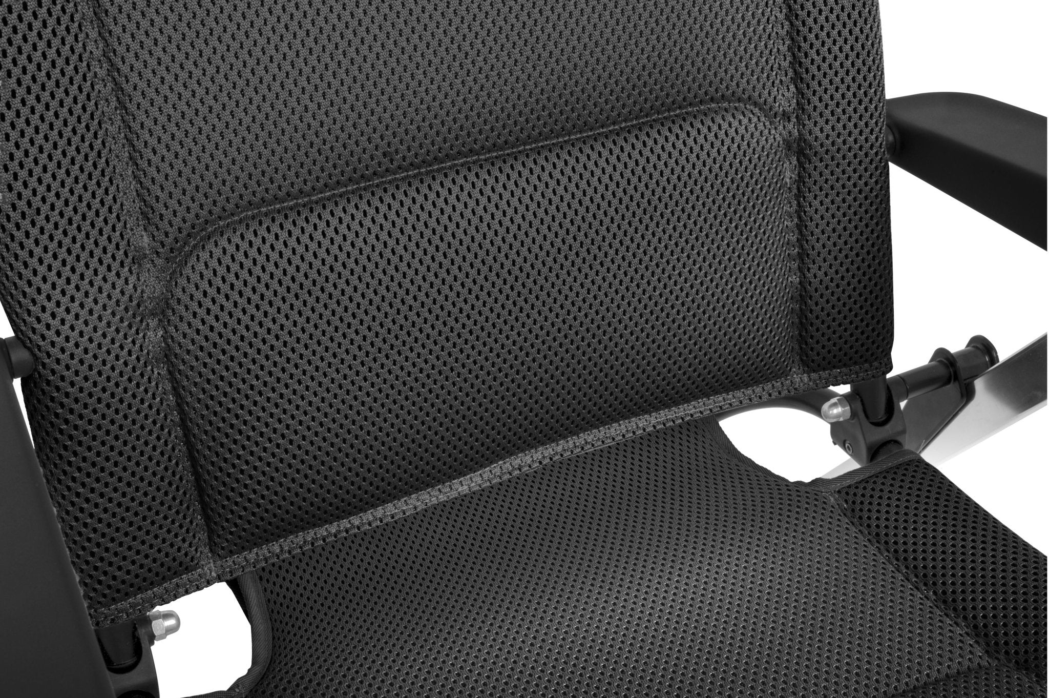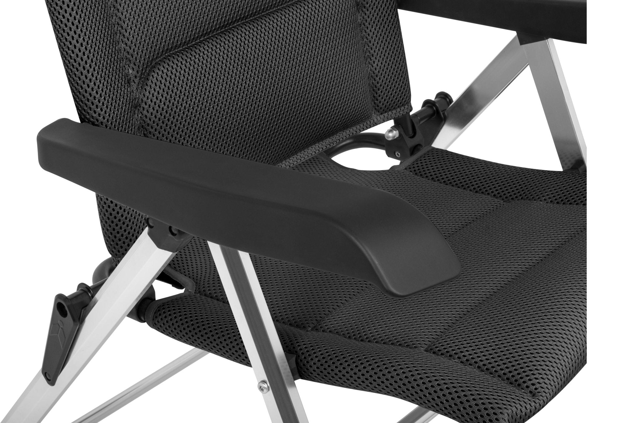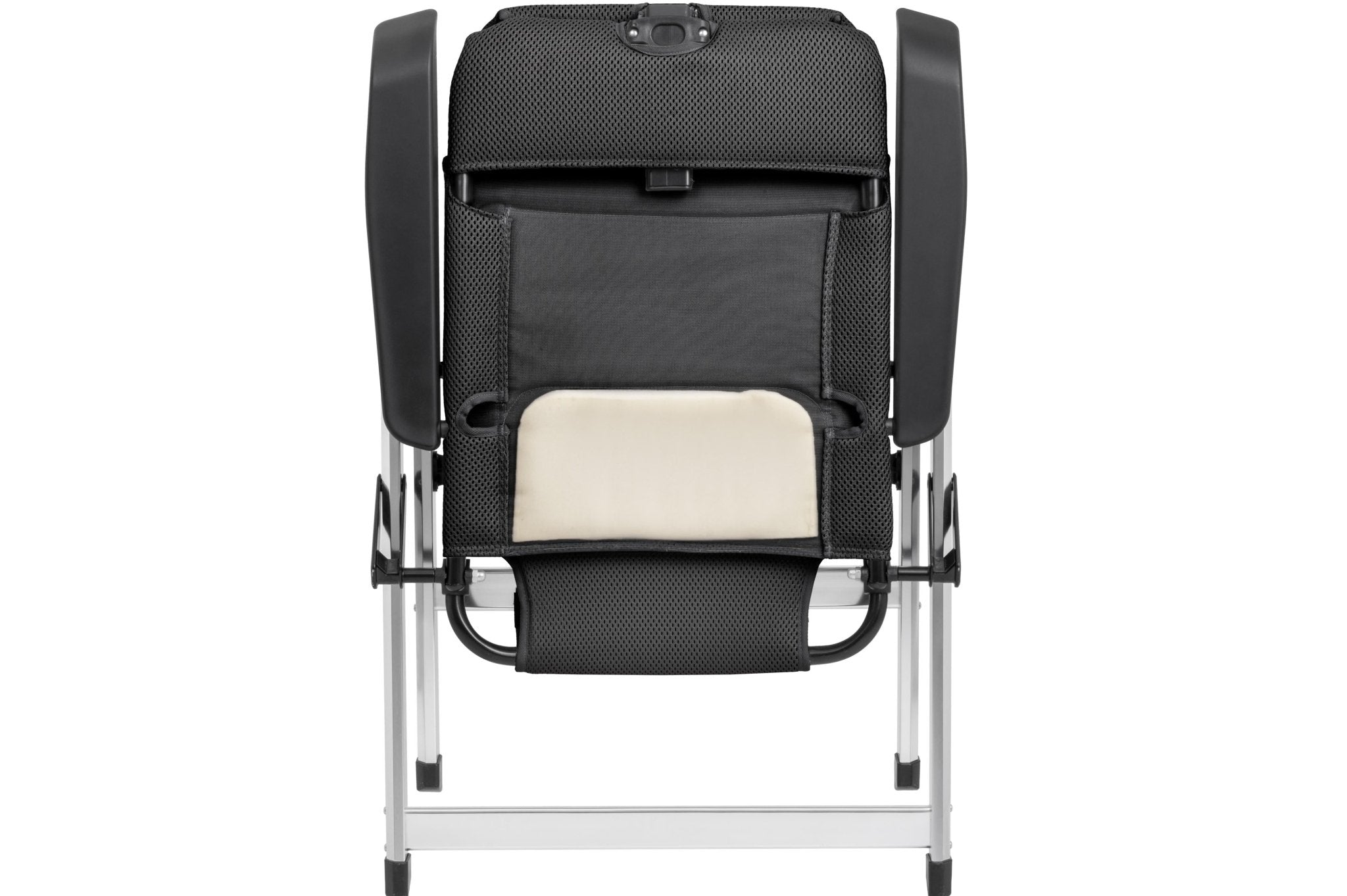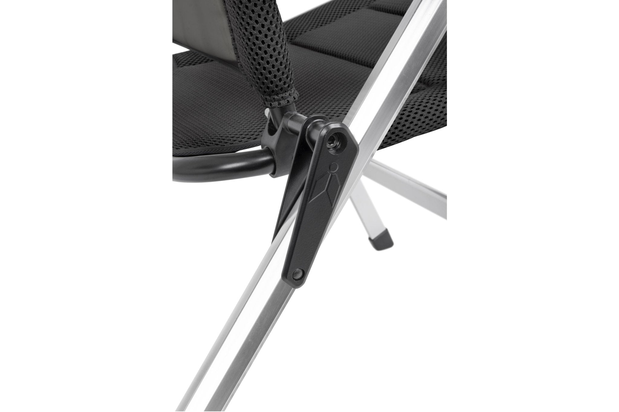 The comfortable 4-legged high-back chair from the Rebel collection combines space-saving design with maximum comfort. Thanks to innovative joints, the rear leg and headrest can be folded away, significantly reducing the chair's height when folded – ideal for vehicles with limited storage space. The height-adjustable headrest provides additional comfort. The lacquered aluminum frame with a trapezoidal profile offers stability, while the 3Durafeel Pro fabric on the seat and backrest ensures comfortable support. With a 5-position adjustable backrest, ergonomic lumbar support, and an integrated organizer pocket, this chair is the perfect choice for relaxed outdoor experiences.