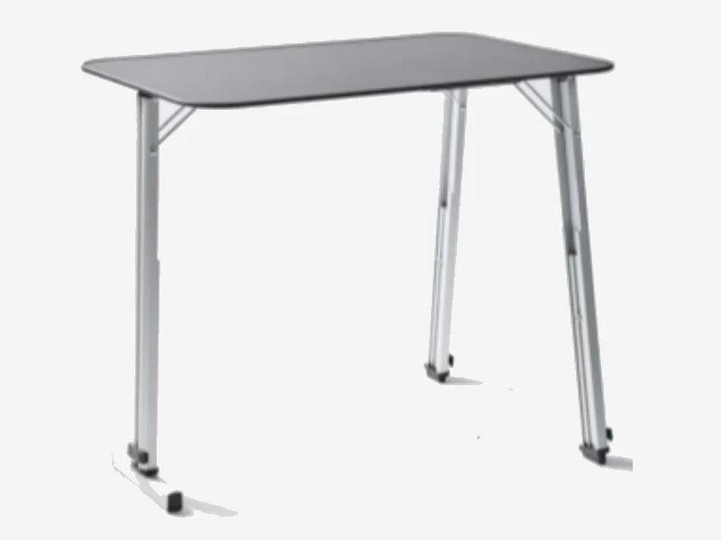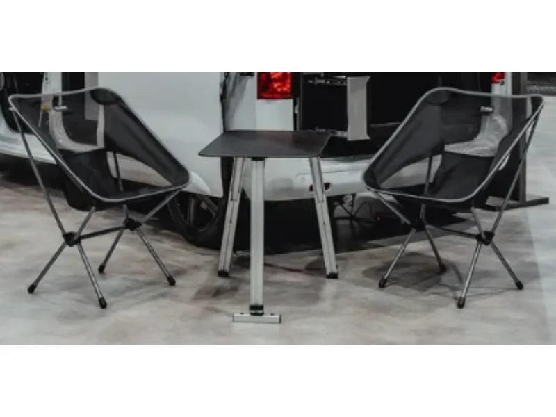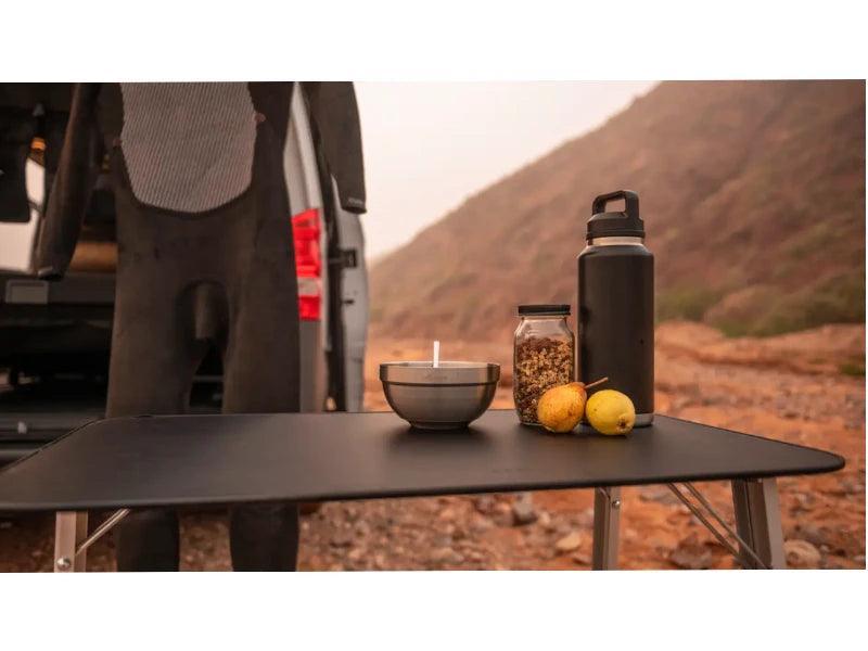 The CROSSCAMP multifunctional camping table is extremely versatile. Thanks to its three continuously telescopic legs, you can position its tabletop horizontally on virtually any terrain—whether in the mountains or on the beach. When the aluminum legs are fully extended, it even transforms into a true standing table. As a robust outdoor custom piece, the CROSSCAMP multifunctional table, which weighs just 5.5 kg, is also weatherproof and can easily be left outside overnight. Inside your CROSSCAMP Lite, its black worktop perfectly complements the seating area, which remains easily accessible thanks to its tripod design. In the CROSSCAMP Flex, the multifunctional table can be hung as usual on the piping rail in the kitchen unit thanks to integrated brackets and can be set up with just one leg, for maximum legroom.