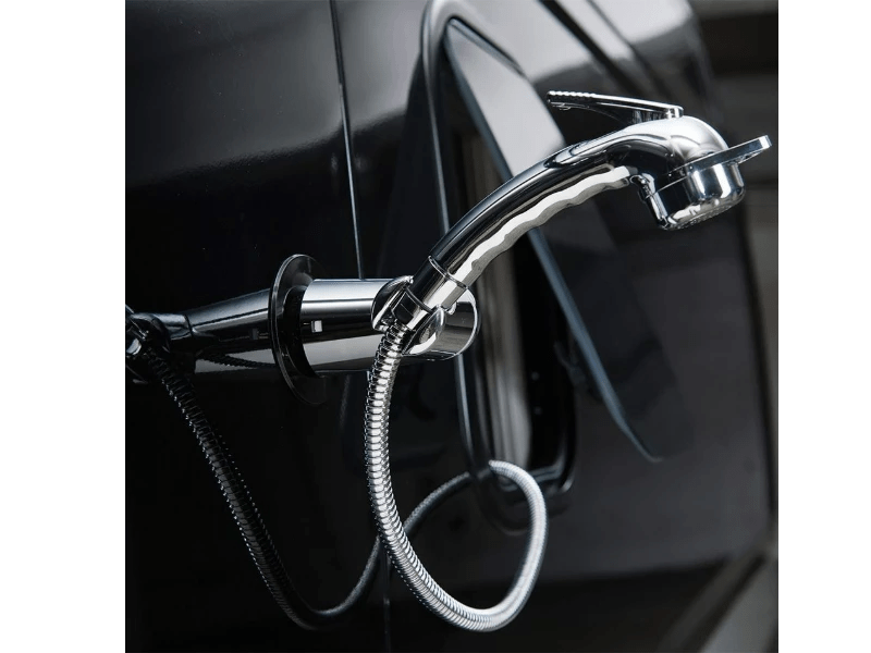 With this shower head mount, showering outdoors becomes a pleasure: The vehicle's shower head is simply extended out of the bathroom window and secured in the desired position using the rotating mount. The mount itself is easily attached to the exterior of the vehicle or a window at the desired height using the suction cup, without the need for drilling. This makes it versatile and ensures carefree showering for all ages.