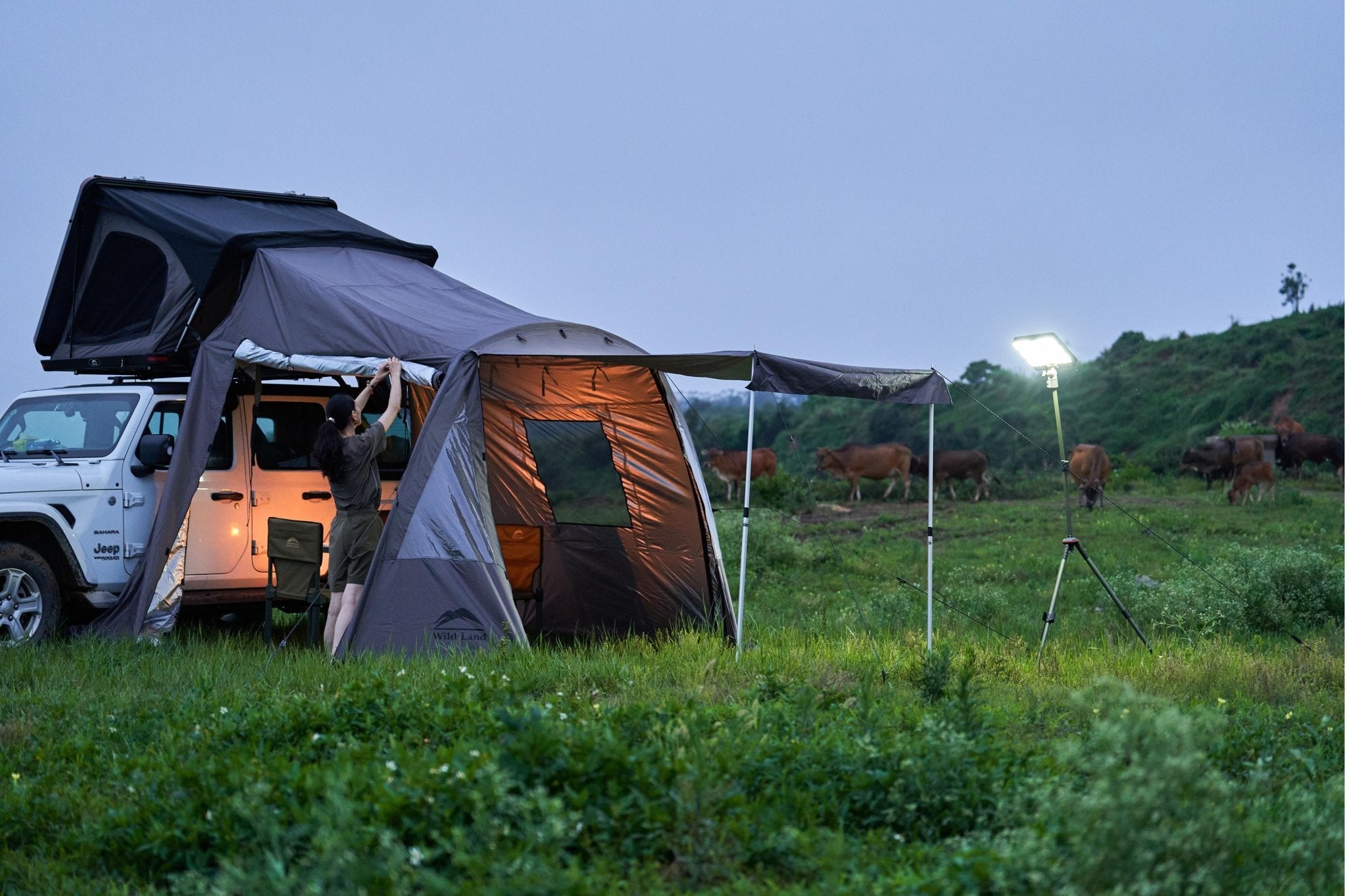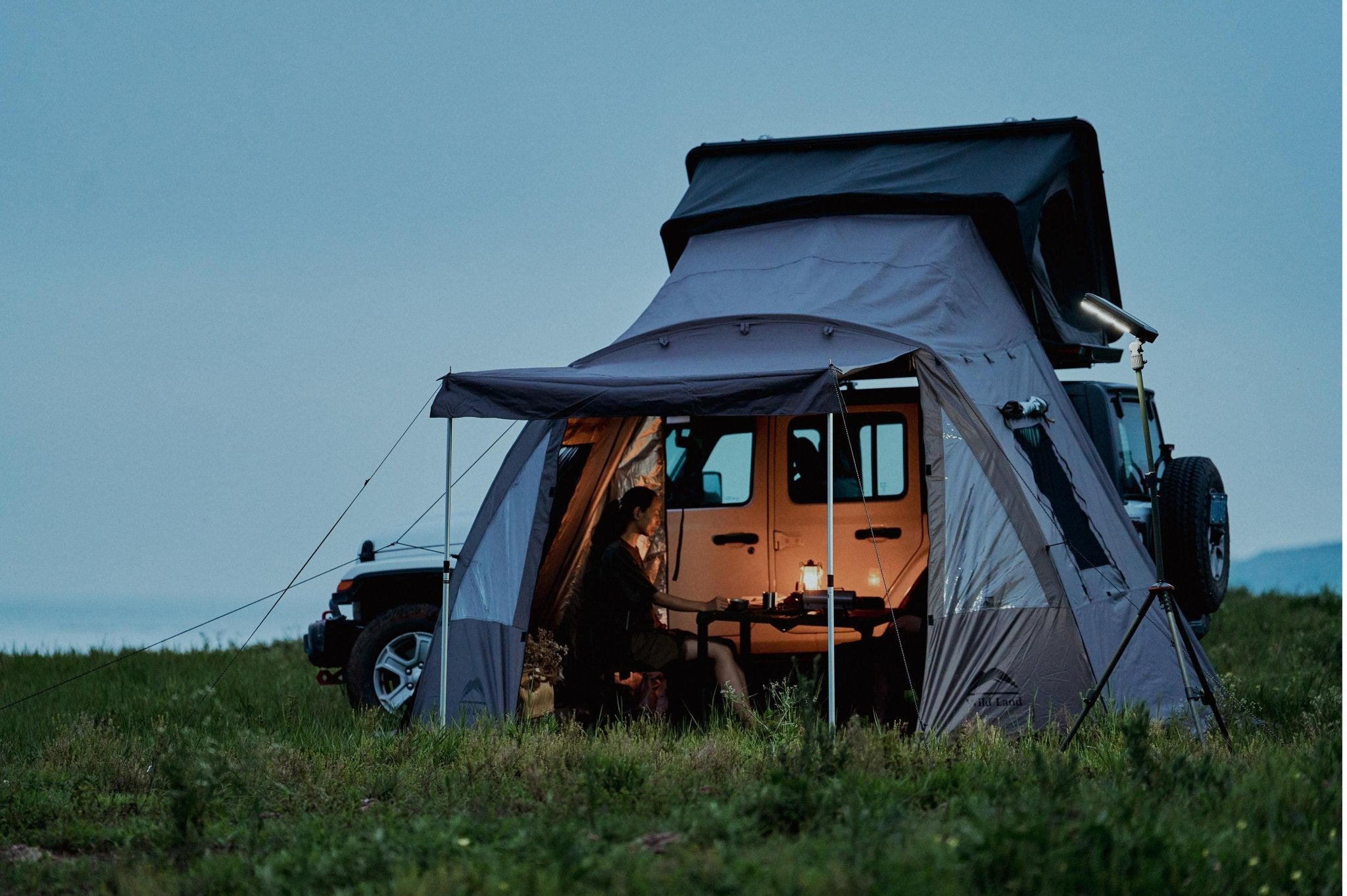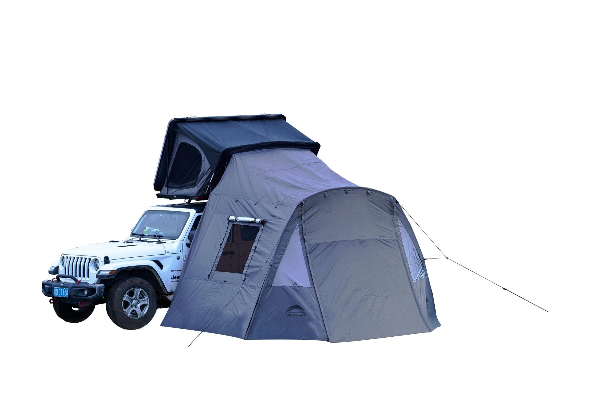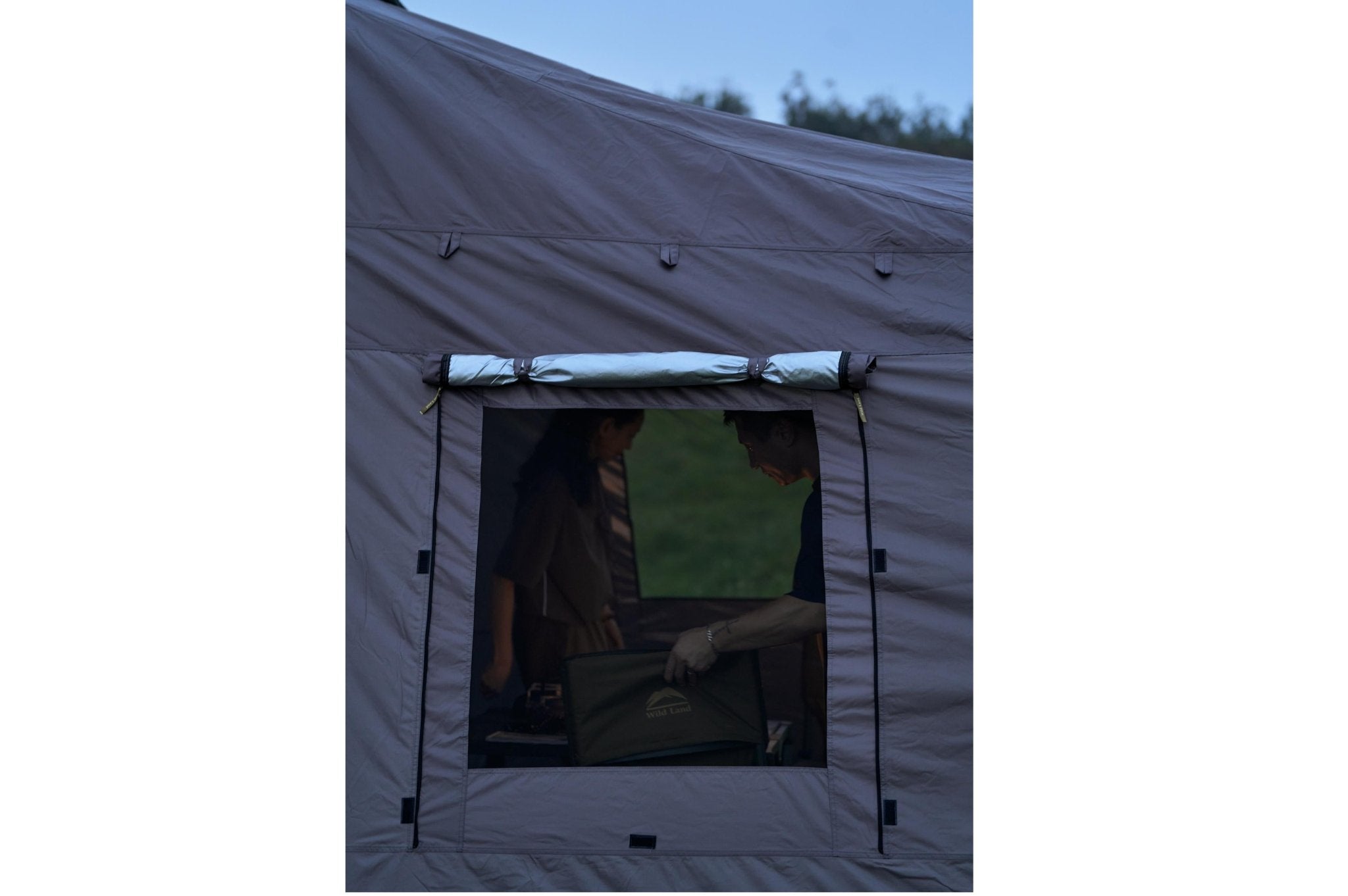 The Wild Land Annex A is an easy-to-assemble awning for your Wild Cruiser 160 rooftop tent. It can be combined with the Wild Land rooftop tent extension to create additional living space for outdoor camping. The silver coating ensures high UV resistance, while the robust 210D ripstop fabric makes it sturdy and durable. Camping enthusiasts, overlanders, hikers, and experienced off-roaders know how comfortable and important extra space can be in the great outdoors. This extension is enormous and not only provides room to change clothes or store bags and other gear, but also transforms into a living room. Simply pitch your tent, attach the awning, and you have a spacious living area where you can sit, eat, have a drink, or simply enjoy the view while protected from the blazing sun or pouring rain. Once inside, you'll truly appreciate just how wonderful and amazing camping can be. It not only offers personal protection but also provides additional space for your camping leisure time. Truly one of the best awnings on the market, a unique product that once again characterizes Wild Land and sets it apart from the rest!