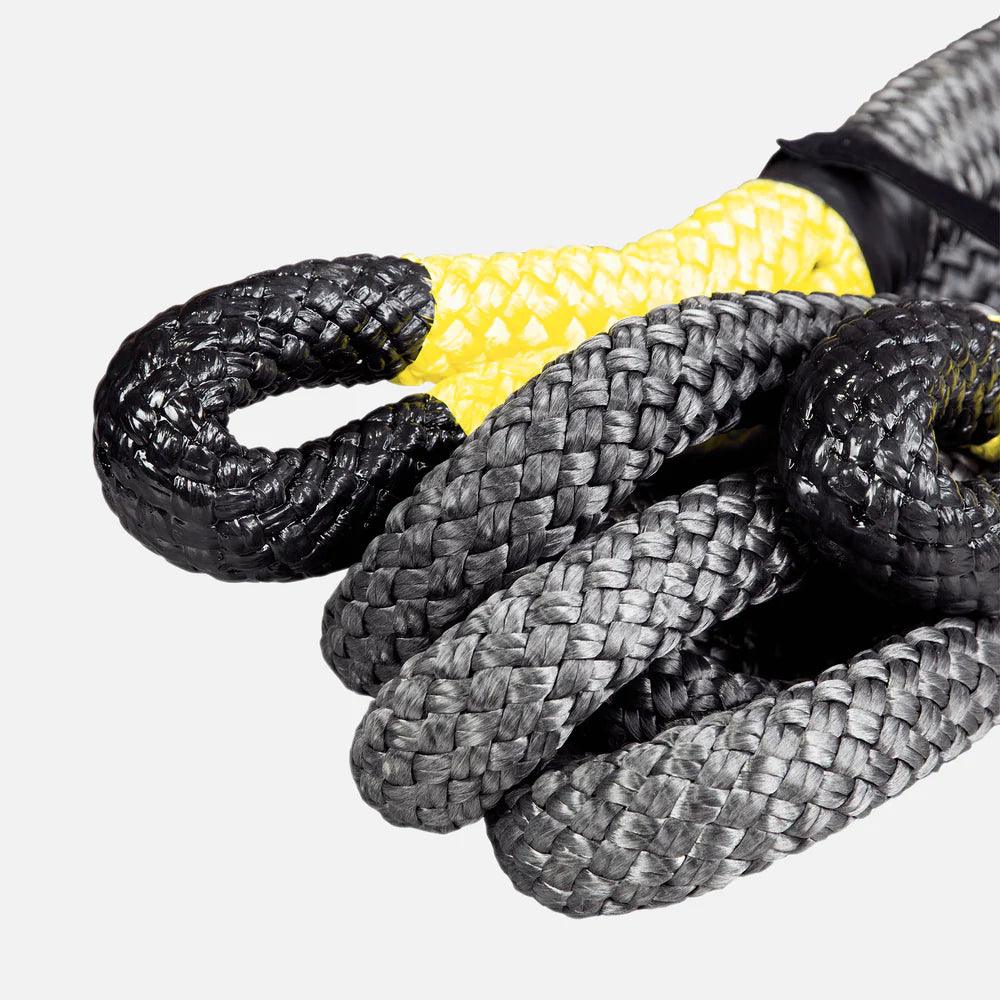 Kinetic recovery ropes are particularly suitable for recovering stuck vehicles. The rope initially stretches and then contracts again. This eliminates the typical jerk when starting up, and the material is protected. At the same time, the recovery vehicle can start moving quickly and thus pull much heavier loads. Horntools recovery ropes have extra-strong loops coated with polyurethane. However, we recommend against using steel shackles – soft shackles are ideal.
