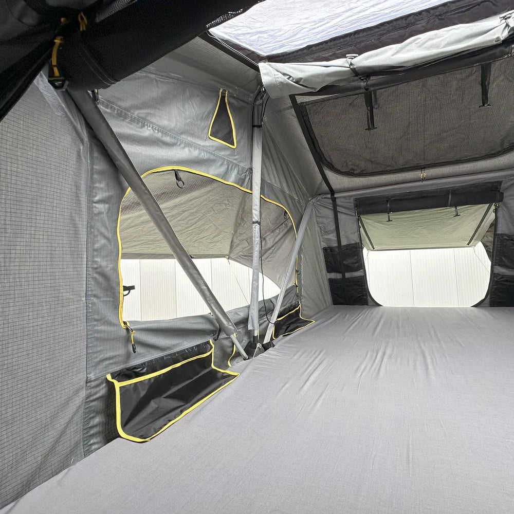 The entrance, side windows, and two roof windows are equipped with mosquito nets and can also be completely closed. The interior of the roof tent also features 12 side pockets for ample storage space. A practical shoe bag (two for the 220 cm roof tent) is also included to prevent dirt from getting into the roof tent.