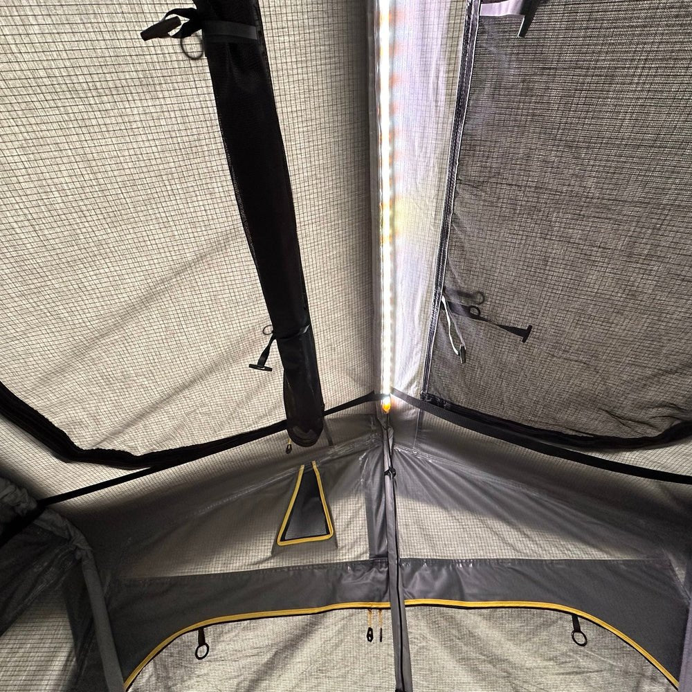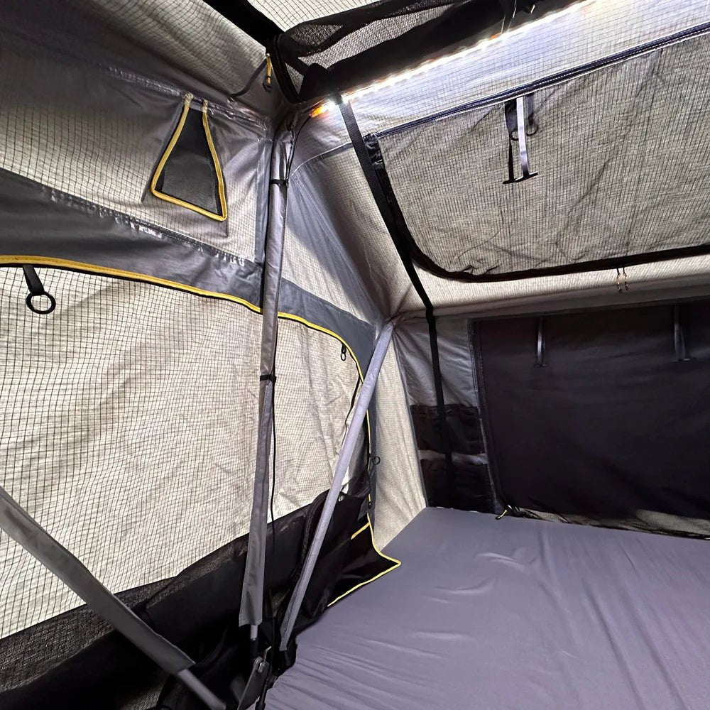 Ambience in the roof tent: The LED lights are integrated into the interior of the roof tent and can be conveniently operated via a dimmable switch and switched between three different colors.