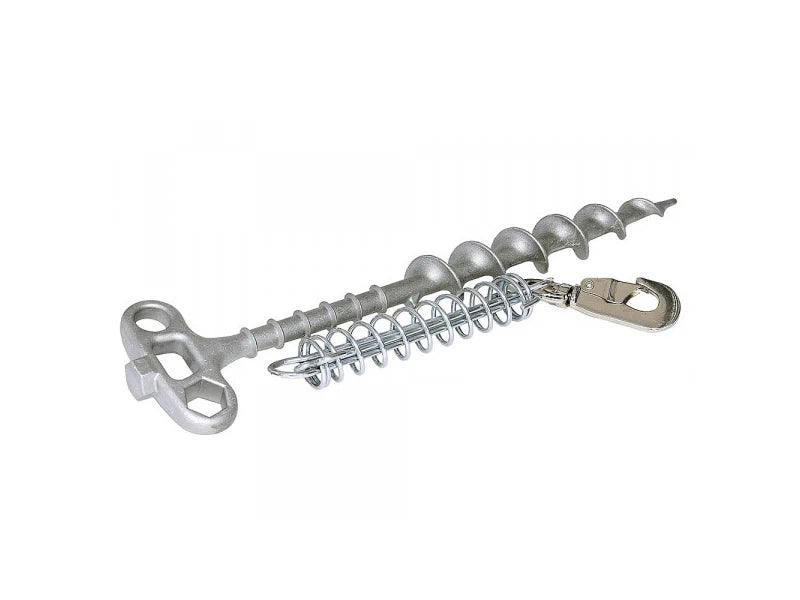 PetPeg is a ground anchor with a shock absorber for leashing dogs, cats, etc., that can be used in a wide variety of soils. Thanks to the flexible height adjustment, the pulling force is always close to the ground, keeping the PetPeg firmly anchored. Simply place the spring on the ground and screw in the screw through the open eye of the spring as deeply as possible, either manually or mechanically. Then check for tightness. The PetPeg is suitable for animals up to a maximum of 45 kg. The shock absorber prevents the leashed animal from injuring itself due to its own strength.