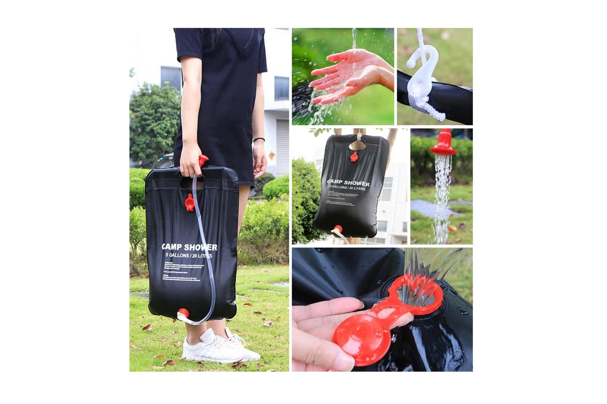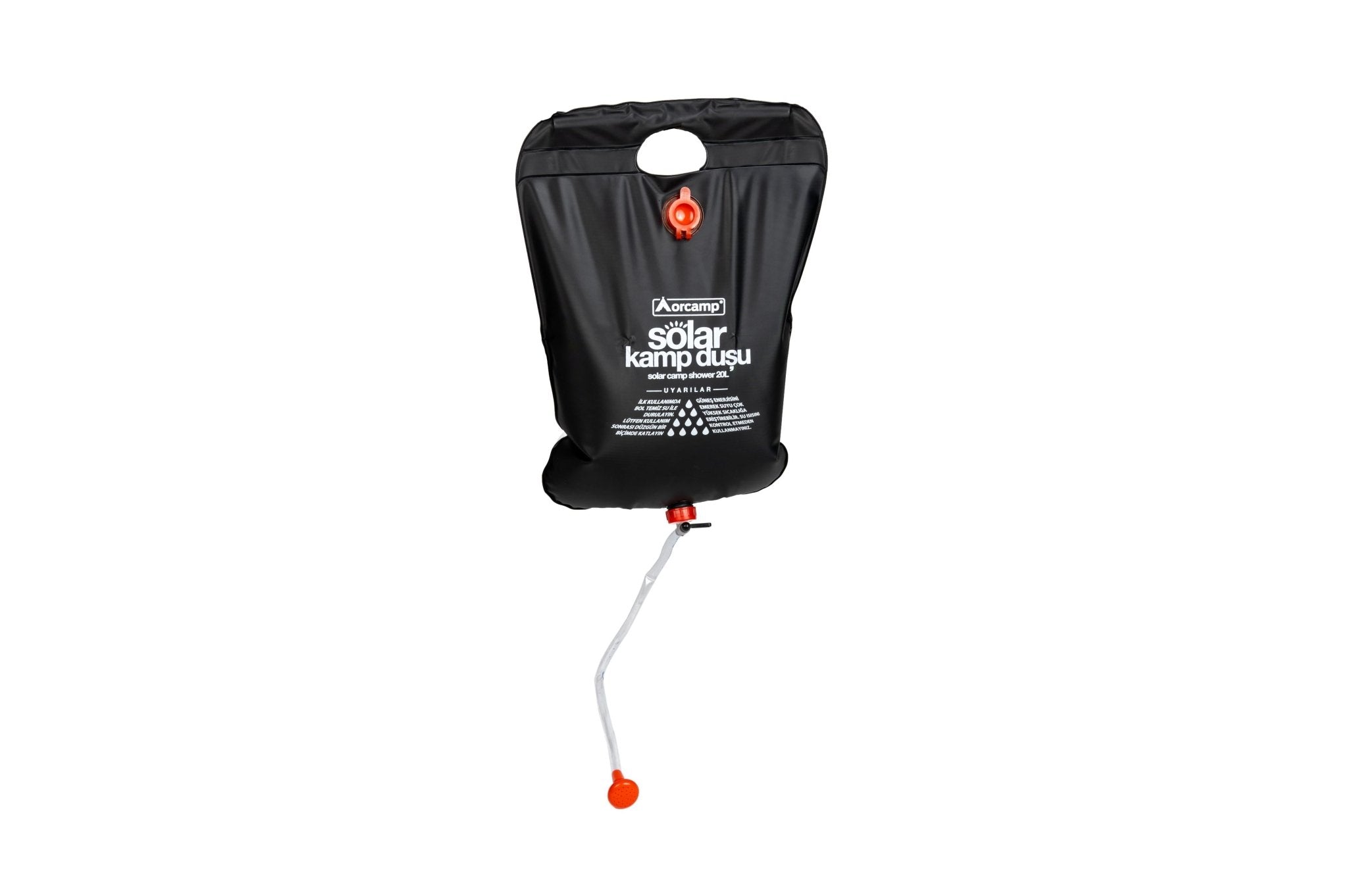 Solar shower with a 20-liter capacity. The solar shower can be hung anywhere. Thanks to its black plastic casing, the water in the bag heats up automatically when the shower is placed in the sun.