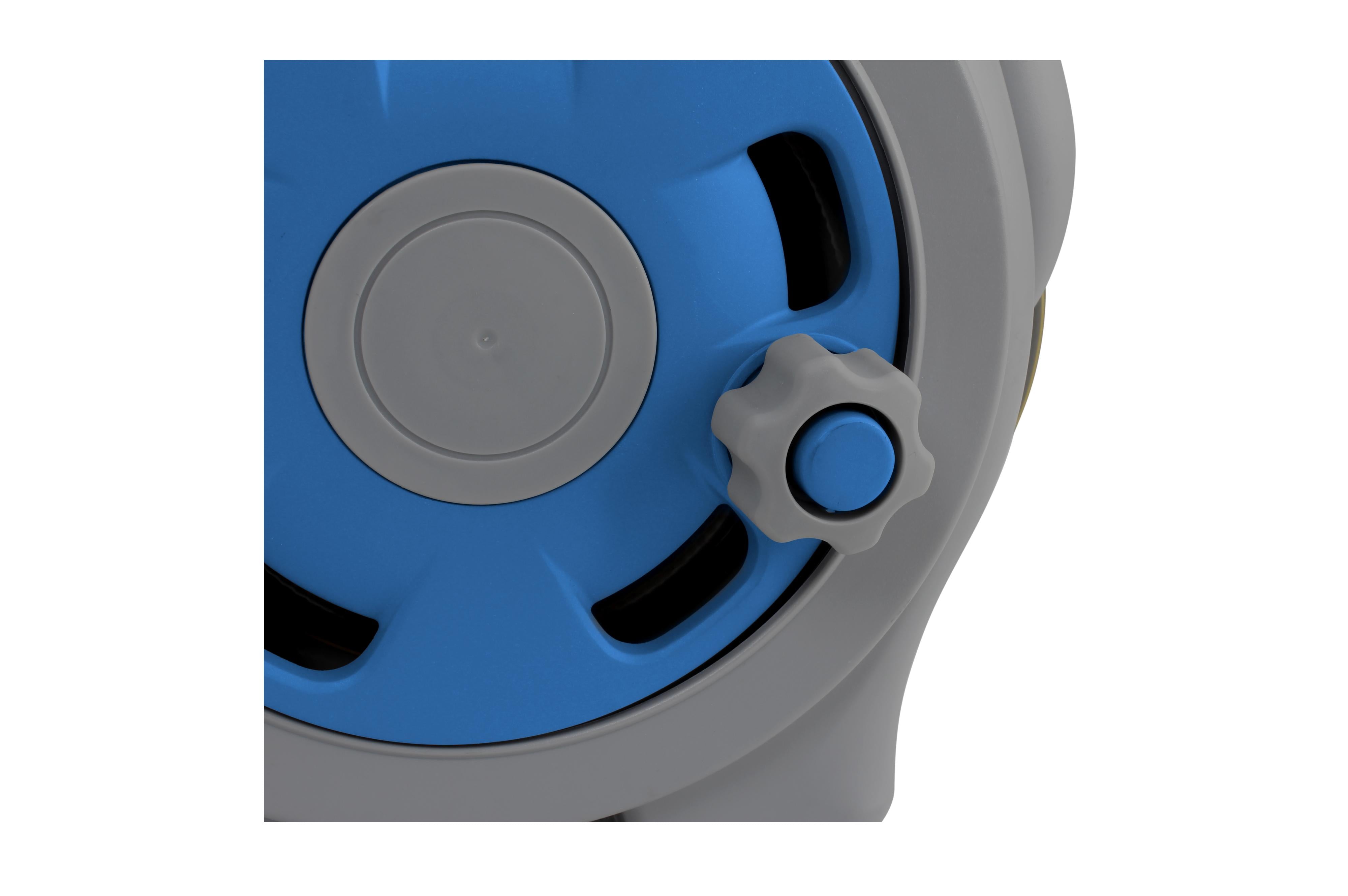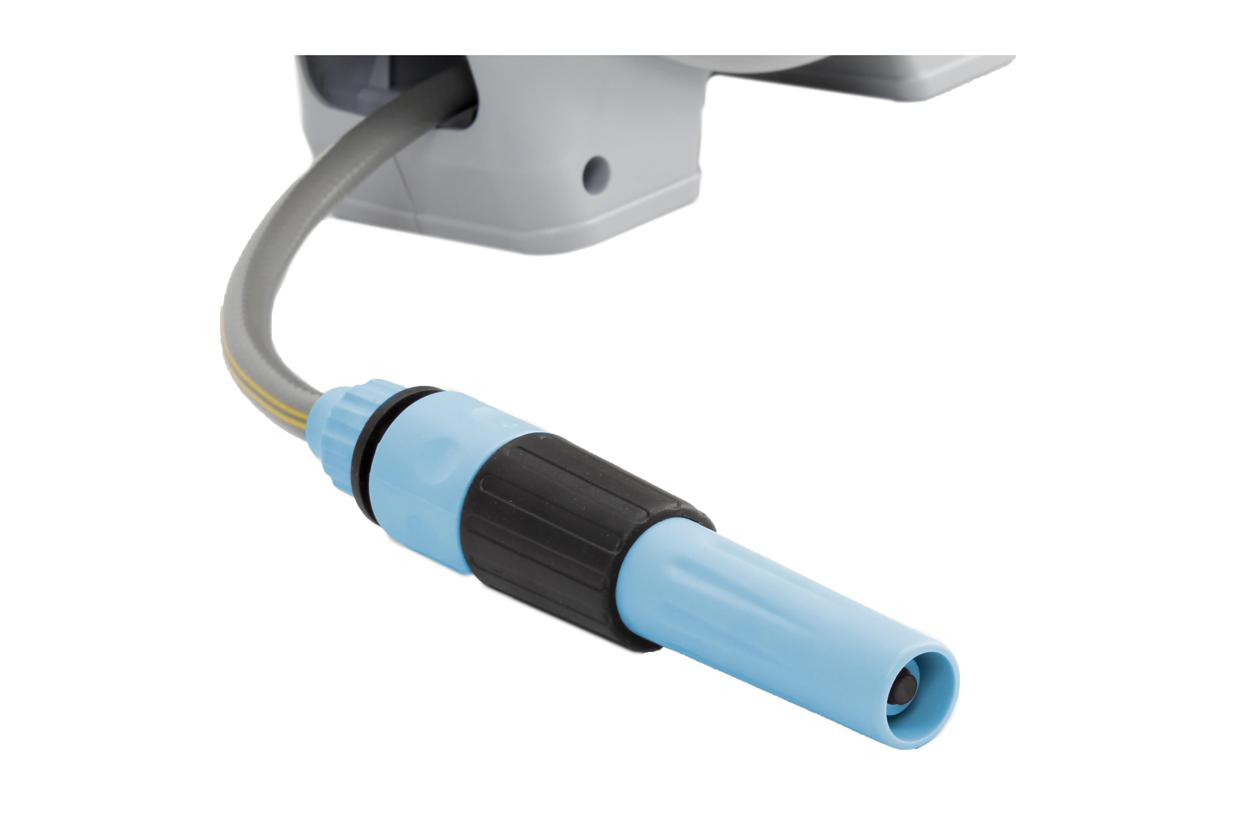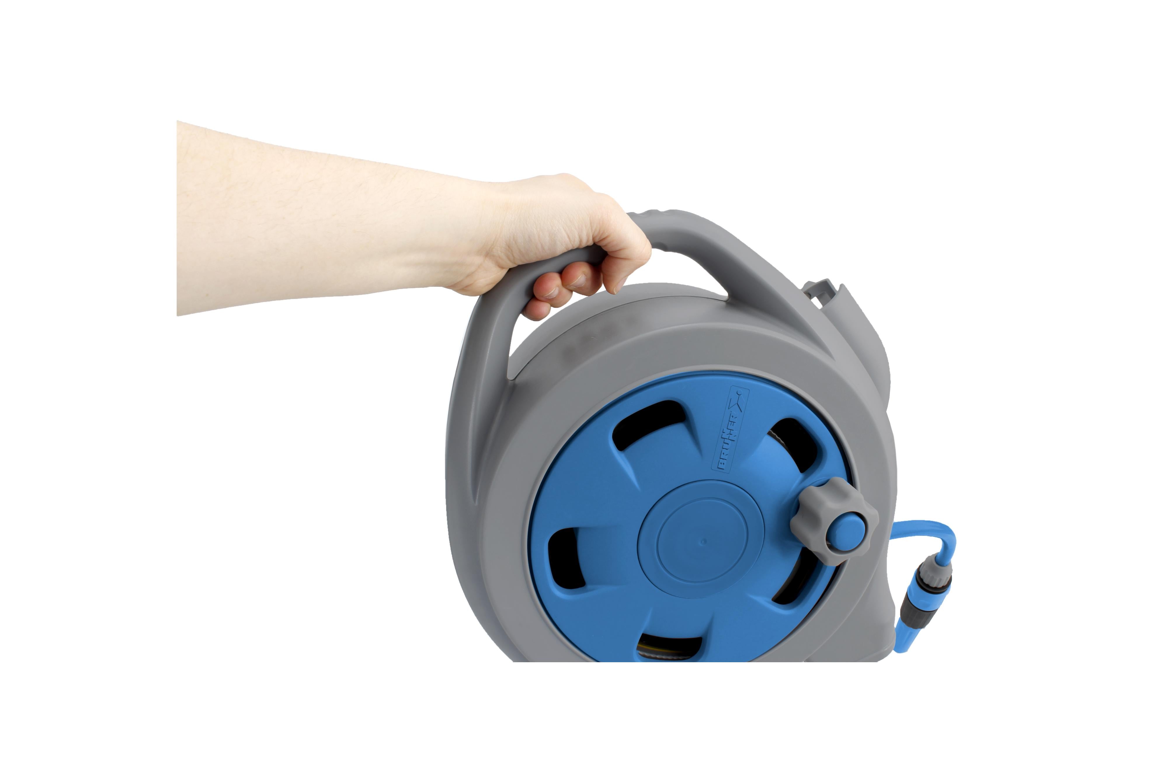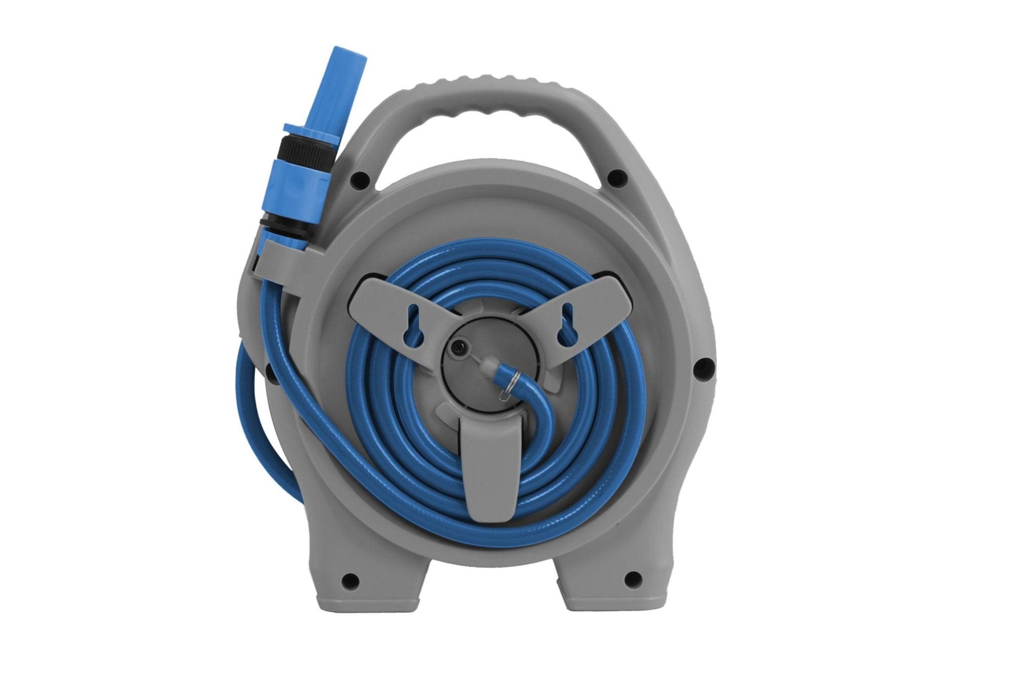 New compact hose reel, ideal for filling tanks or washing vehicles, but also very useful for watering flowers and plants while camping. Robust plastic housing with integrated handle. Included: 11.6 m flexible, food-grade hose (7.9 mm diameter). 3-JET ergonomic lance with variable capacity.