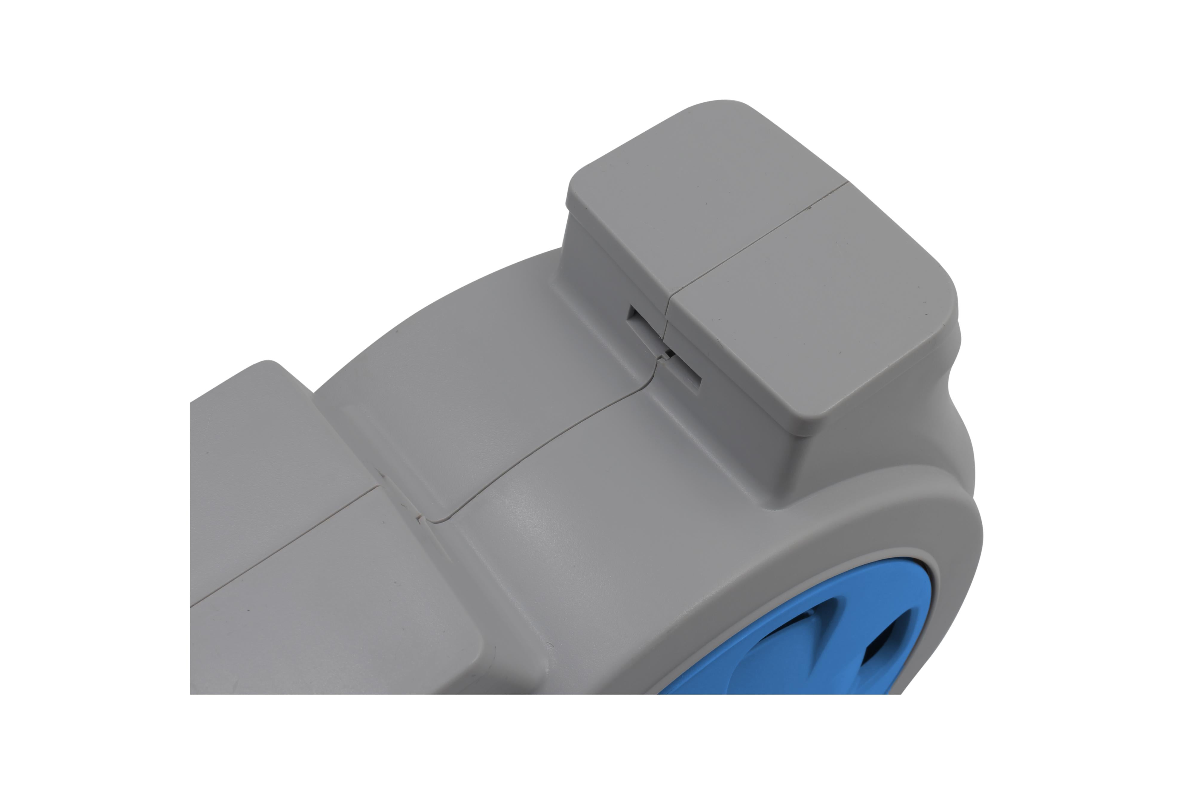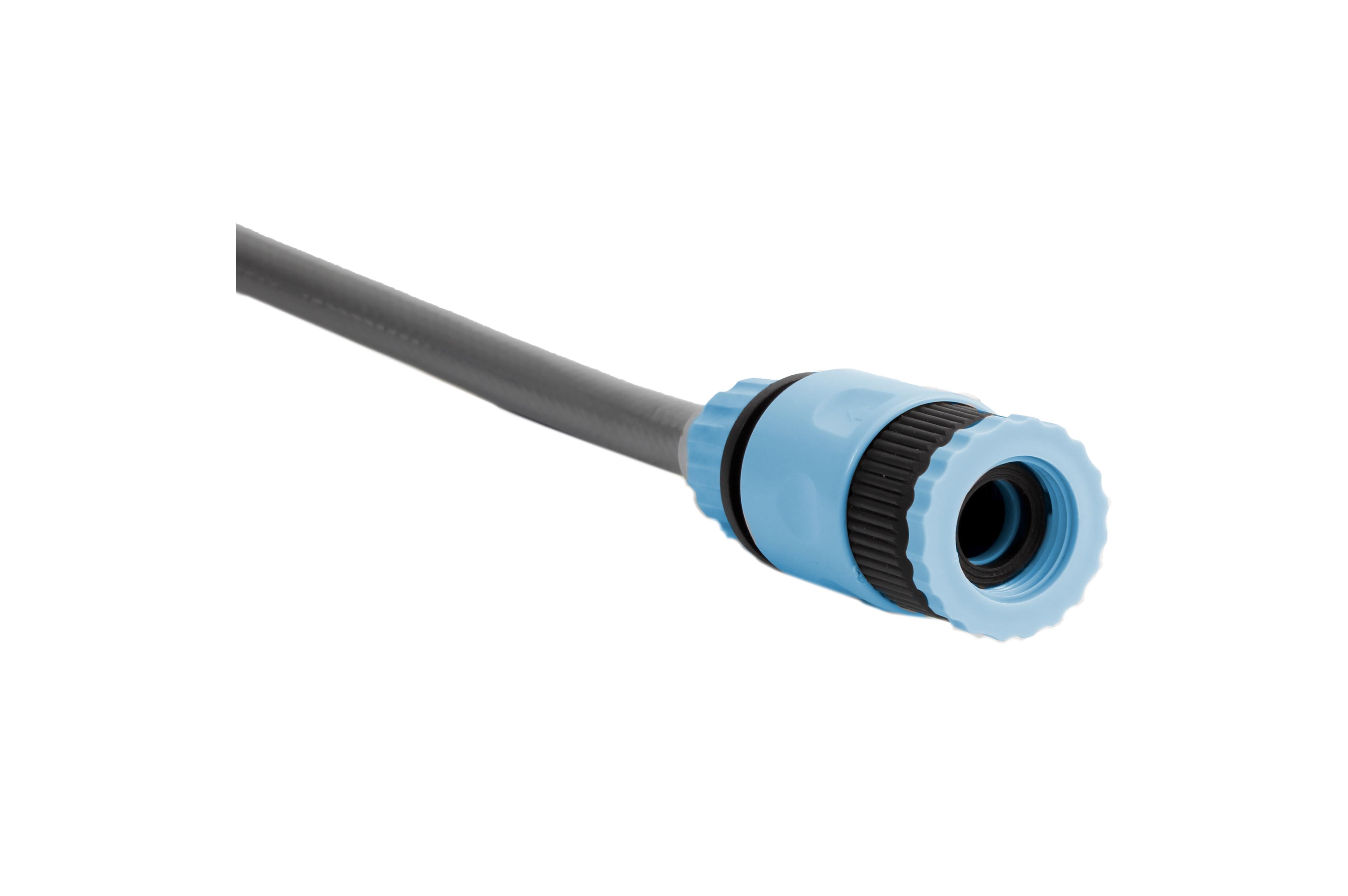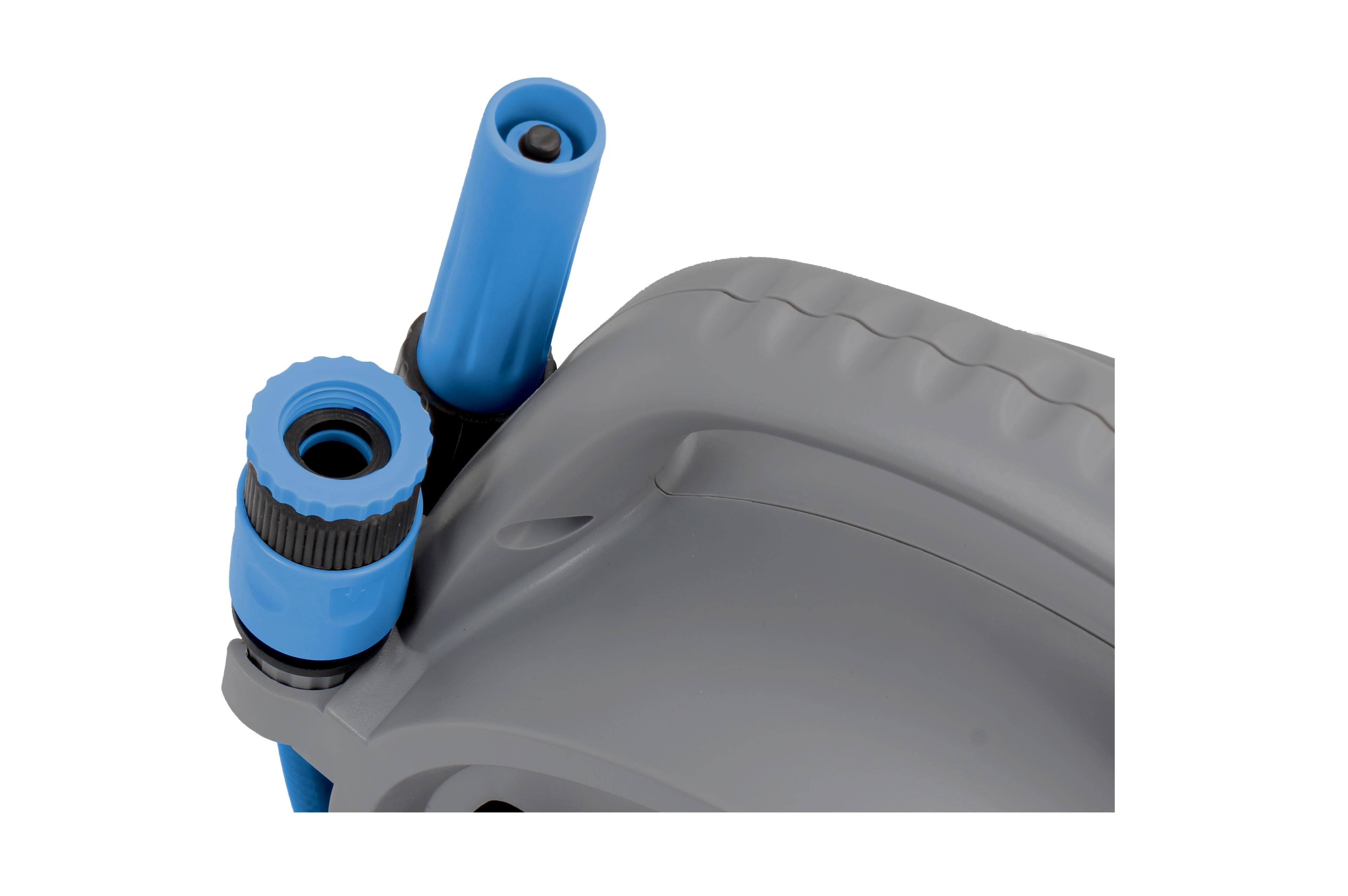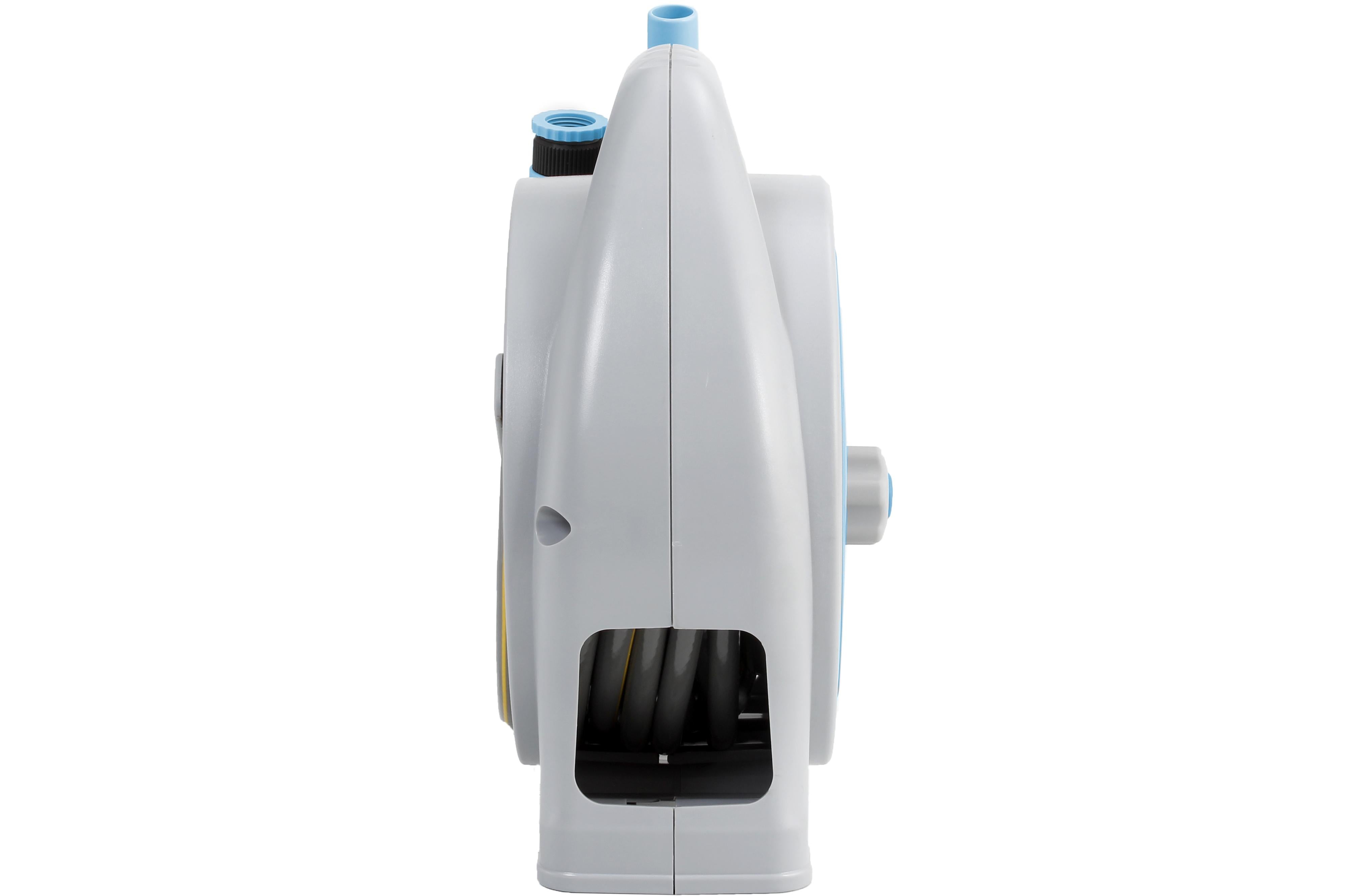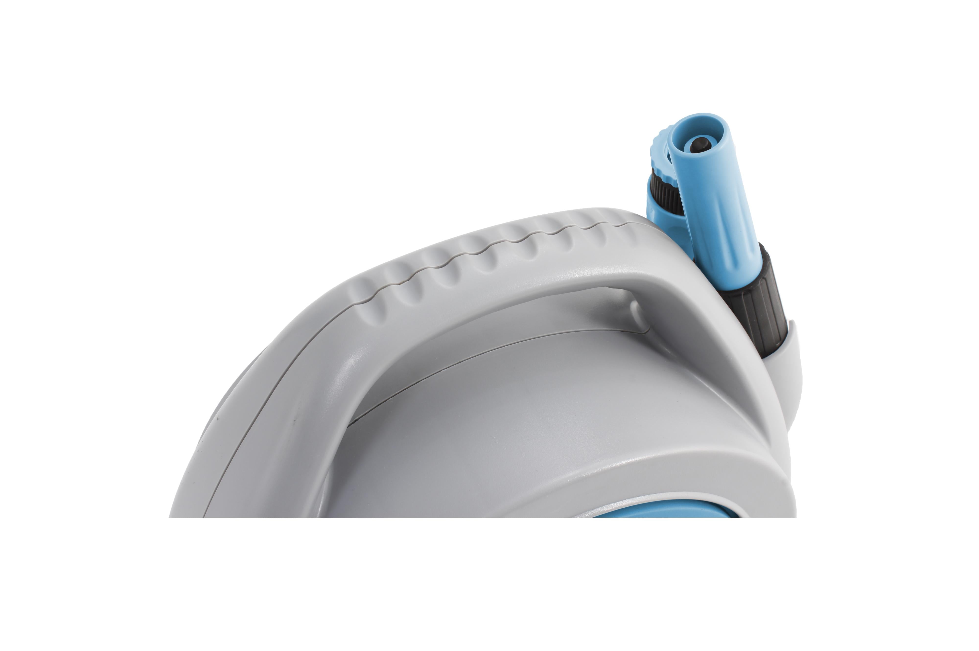 New compact hose reel, ideal for filling tanks or washing vehicles, but also very useful for watering flowers and plants while camping. Robust plastic housing with integrated handle. Included: 11.6 m flexible, food-grade hose (7.9 mm diameter). 3-JET ergonomic lance with variable capacity.