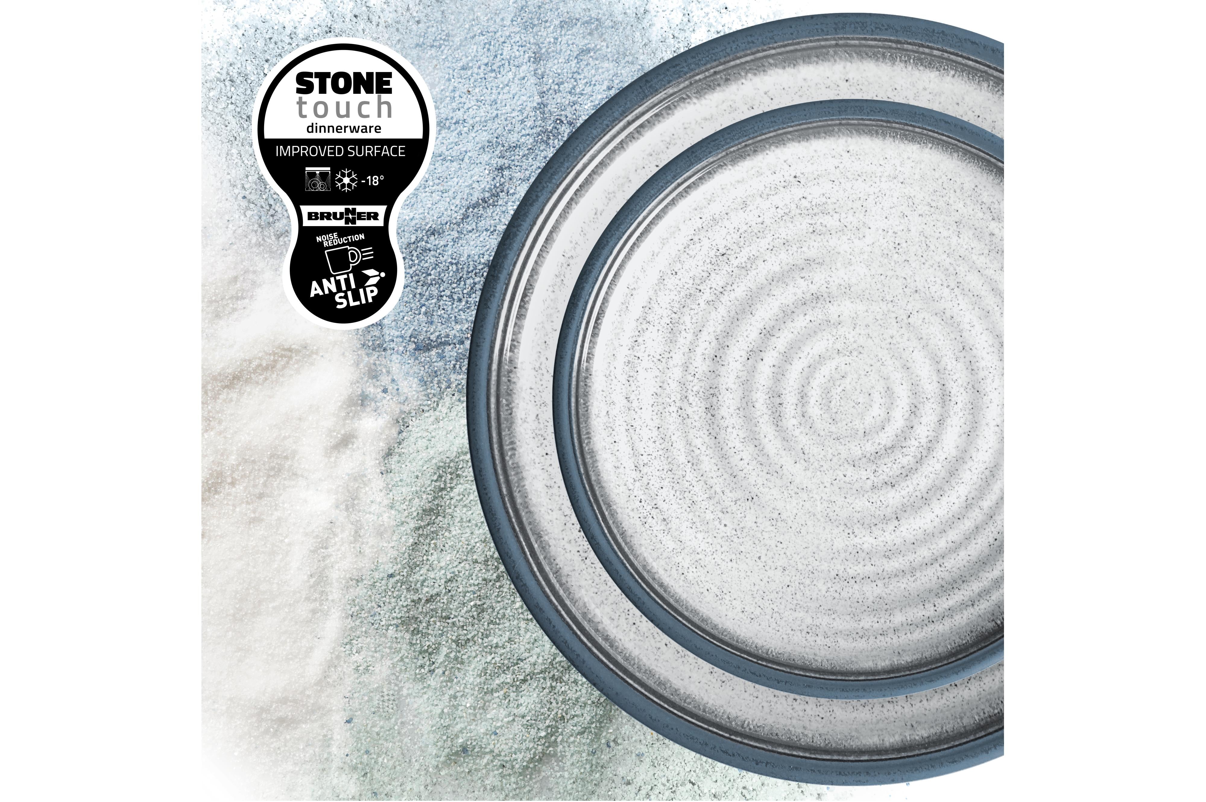 Dinner plate with a 26 cm diameter. Made from high-quality melamine, a material created by combining melamine resins and cellulose, distinguished by its exceptional hardness and lightness. This plate also features a Stone Touch coating, giving it a porcelain-like shine. It is food-safe, dishwasher-safe, break-resistant, and highly durable. A silicone ring on the underside prevents the plate from slipping.