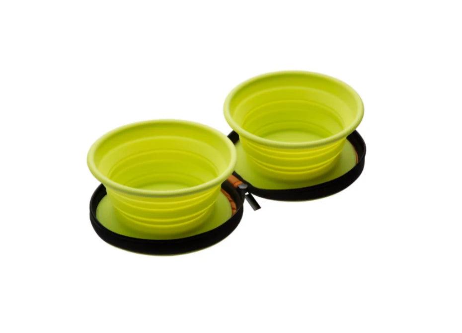 This silicone pet bowl set with two bowls is foldable and comes in a beautiful carrying case, making it ideal for travel. The bowls are attached with Velcro and can be easily removed from the case.
