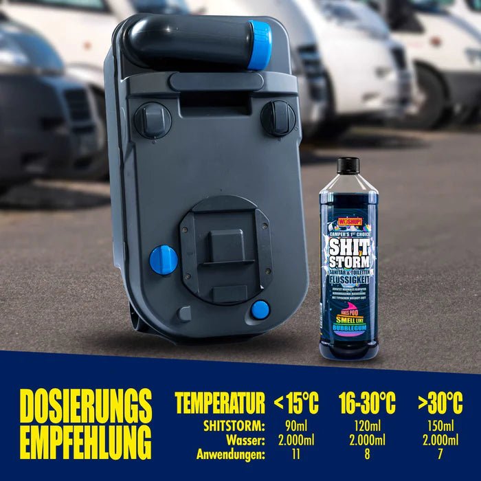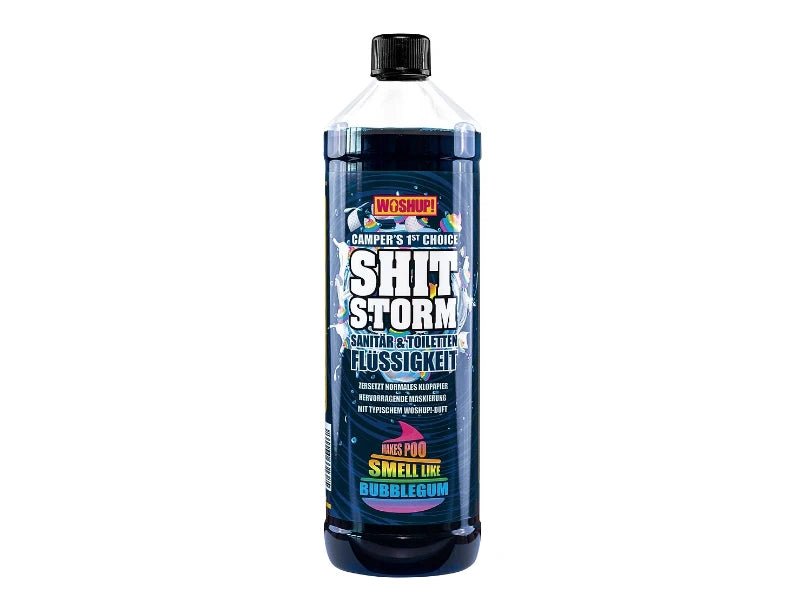 The SHIT STORM decomposes feces and toilet paper into a homogeneous liquid. It reliably and effectively masks toilet odors with a dark dye. Biodegradable.