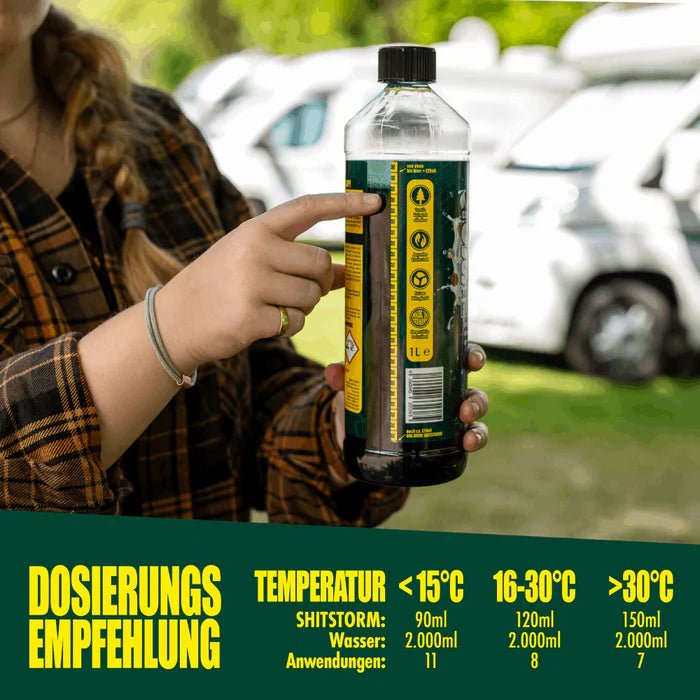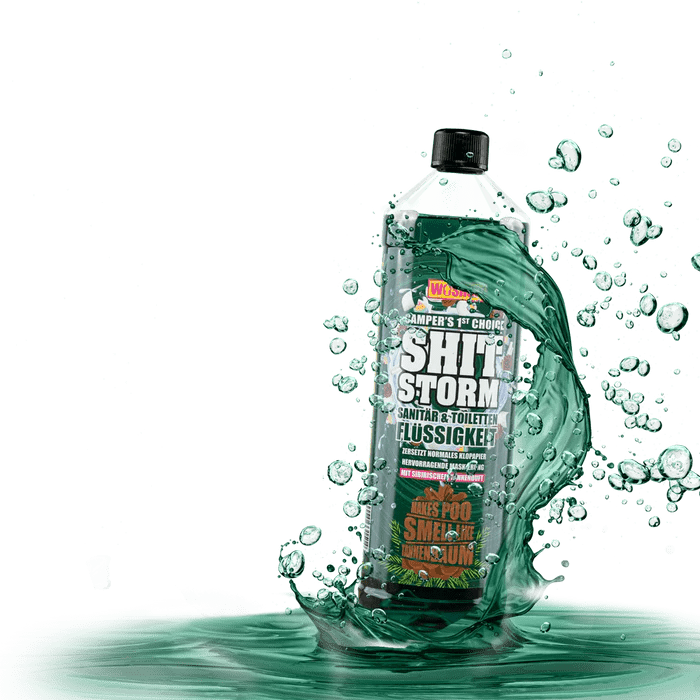The SHIT STORM decomposes feces and toilet paper into a homogeneous liquid. It reliably and effectively masks toilet odors with a dark dye. Biodegradable.
