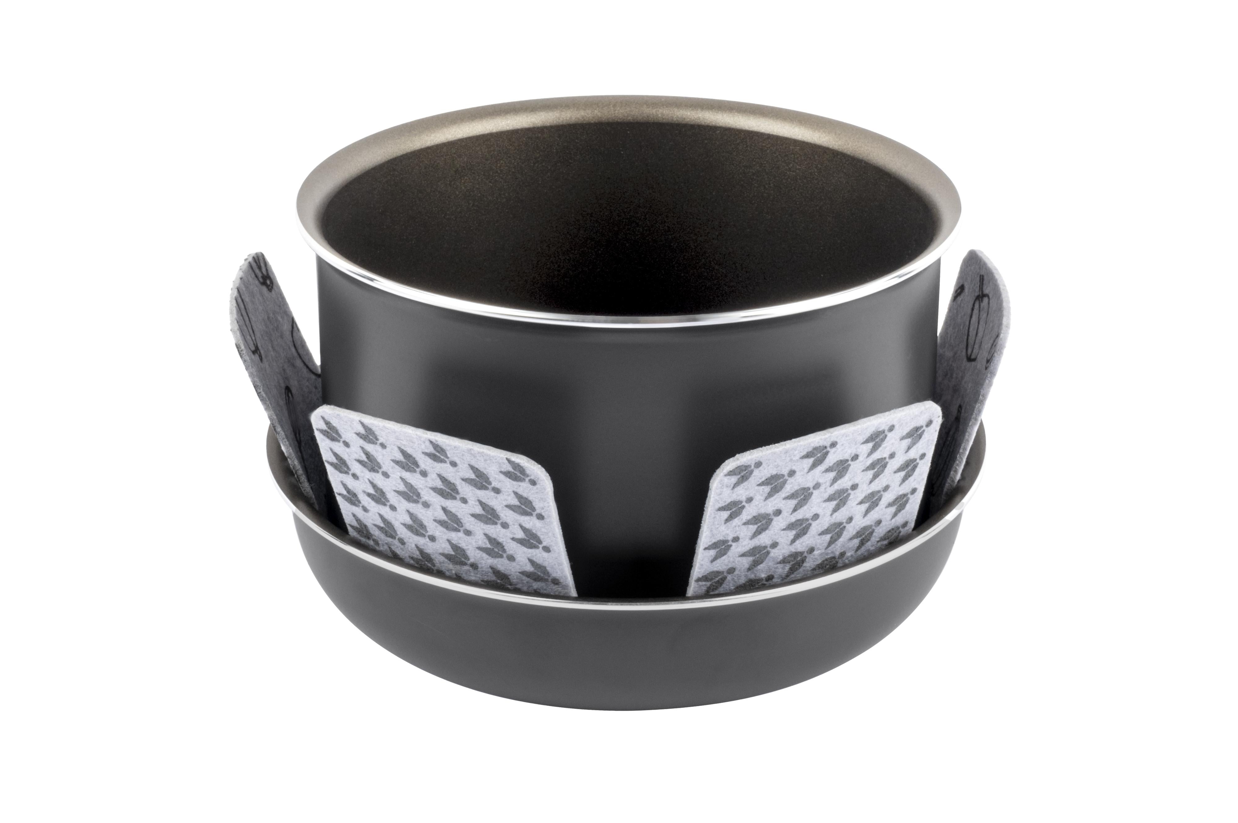 The stackable Torralta cookware set is the ideal choice for RV and boat owners looking for efficient cookware. Designed for compact cooktops, it offers an excellent surface area to volume ratio for preparing larger quantities. Thanks to the special rim design, pans stay securely in place. Made from recycled aluminum, the set is compatible with all types of cooktops, including induction. The folding handles ensure space-saving storage, and a removable handle for the inner pots and pans is also included.