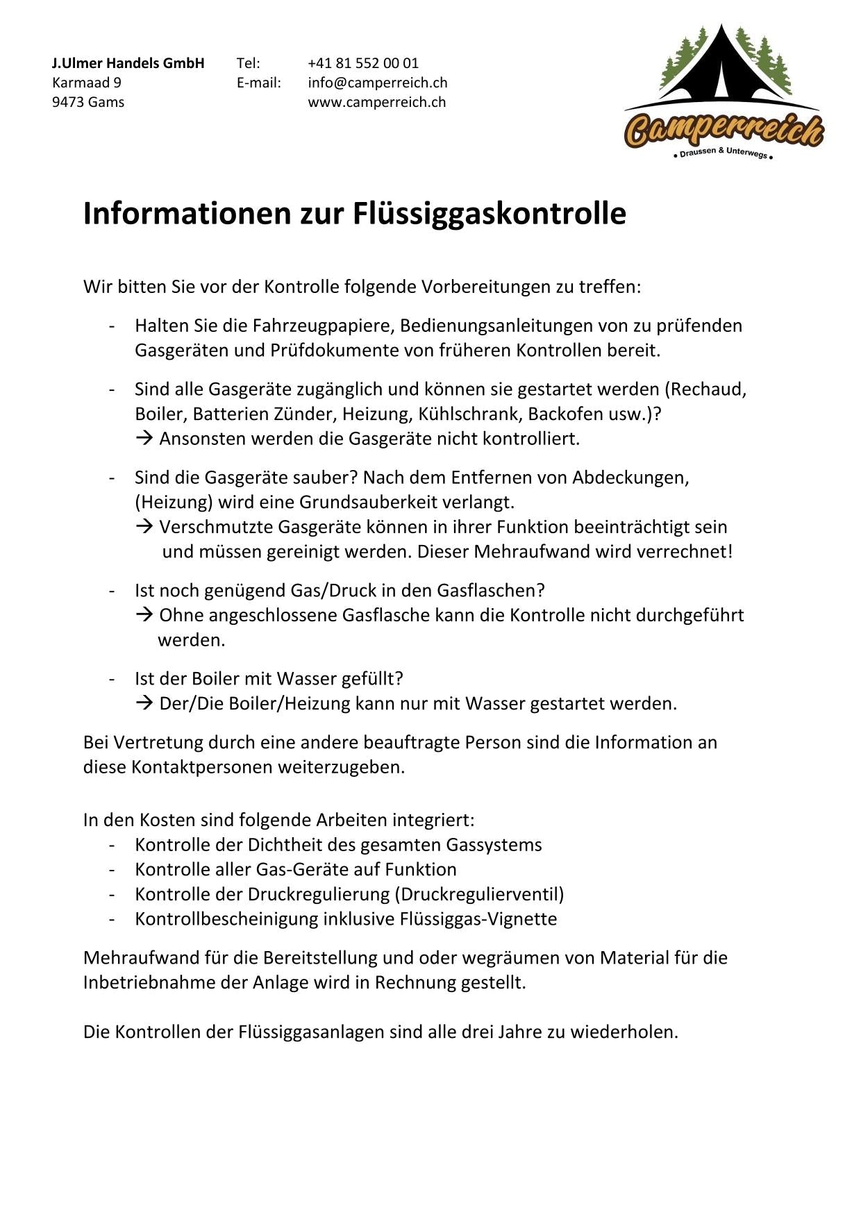 Periodische Gaskontrollen schützen nicht nur die Benutzer von Wohnmobilen, Wohnwagen und Schiffen sondern auch die Nachbarn und sind im Interesse der Allgemeinheit. Aufgrund der Beanspruchung von Wohnmobilen und Schiffen ist ein Kontrollrhythmus von 3 Jahren festgelegt worden. Für Veranstaltungen gilt ein einjähriges Kontrollintervall.