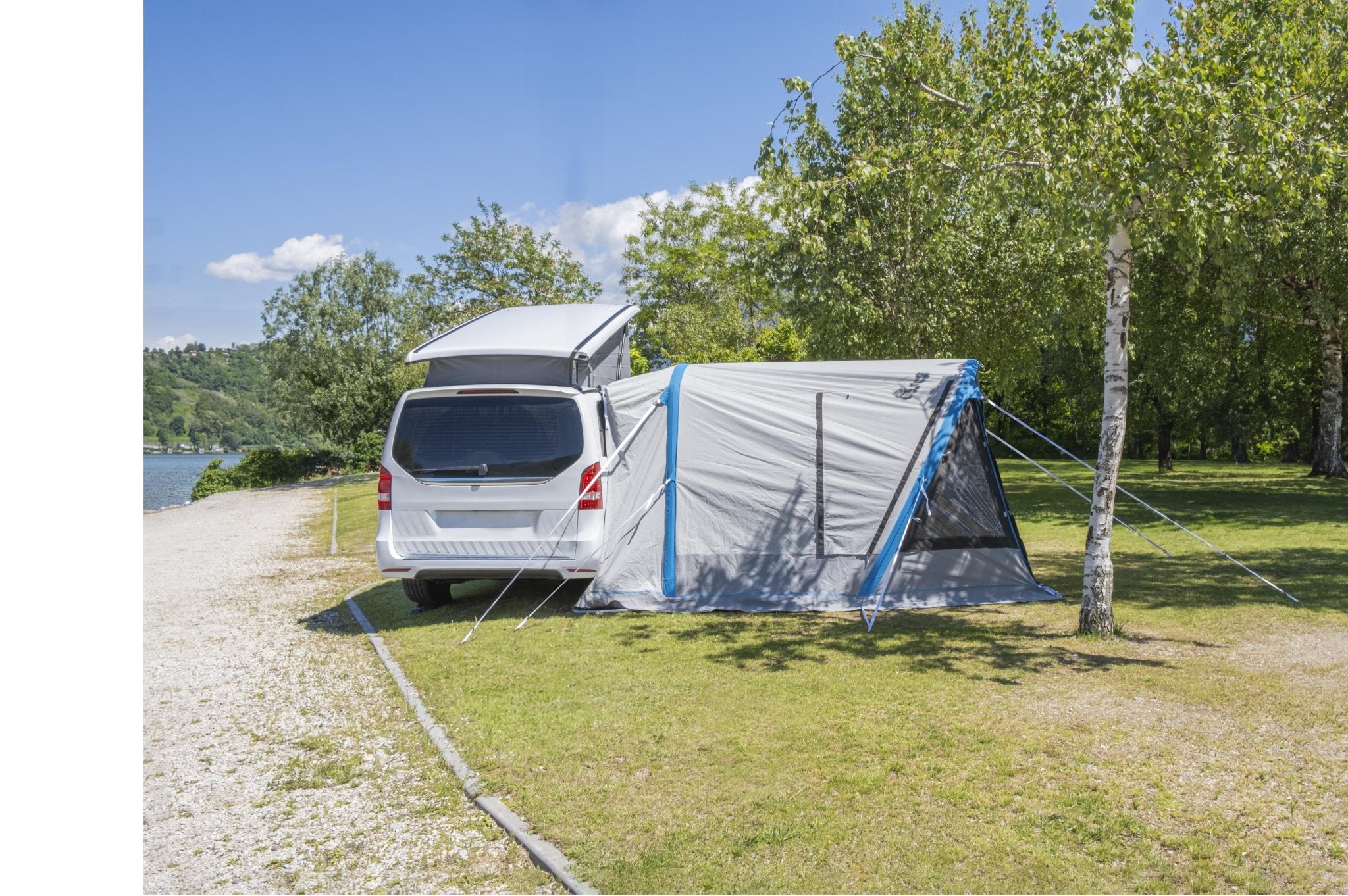 Der Air Travel II hat eine hochwertige AIR Tech-Luftstruktur mit Oneflate-Aufblassystem. Die Stoffe sind aus robustem Pure Pro Polycotton gefertigt, für ein angenehmes Raumklima und geringe Kondensation. Hohe UV-Beständigkeit verlängert die Lebensdauer. Merkmale umfassen eine stabile pneumatische Struktur, ein Einkammer-Aufblassystem, einen großen Vordereingang als Sonnendach, abnehmbare getönte Scheiben. Seiteneinstieg und Heckklappe sind als Sonnendach konfigurierbar, die Rückwand kann als Veranda genutzt werden. Weitere Features sind getönte Fenster mit Jalousien, Verandamatte, Luftpumpe, und Anschlussmöglichkeiten für Fahrzeuge mit Dachrinnenhöhe von 180 bis 210 cm.