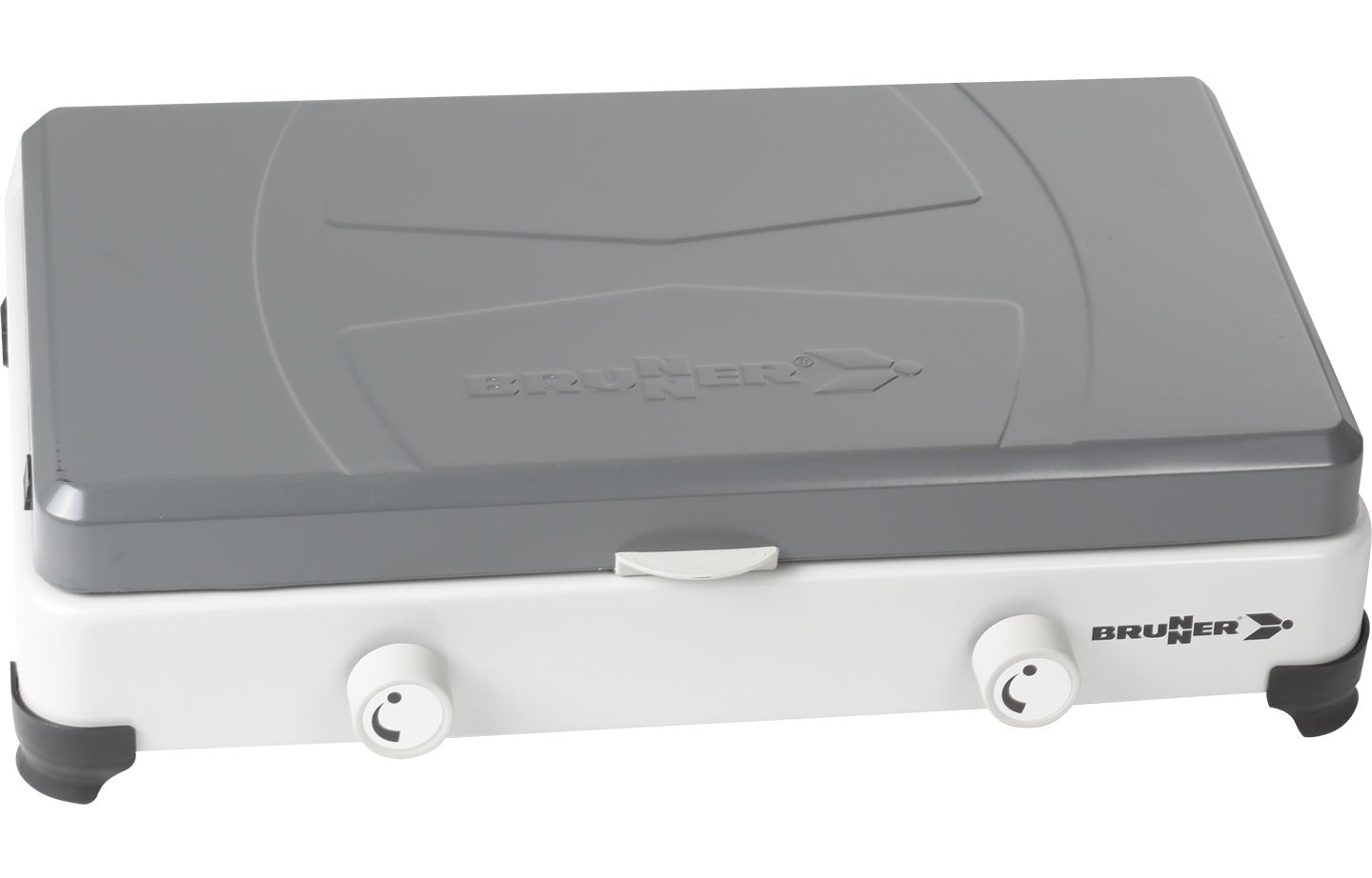 Zweiflamm Gaskocher mit pulverbeschichtetem Metallgehäuse und Deckel. Anschluss: wahlweise mit 1/4" links oder mit Tülle. Ohne Flammendurchschlagsicherung.
