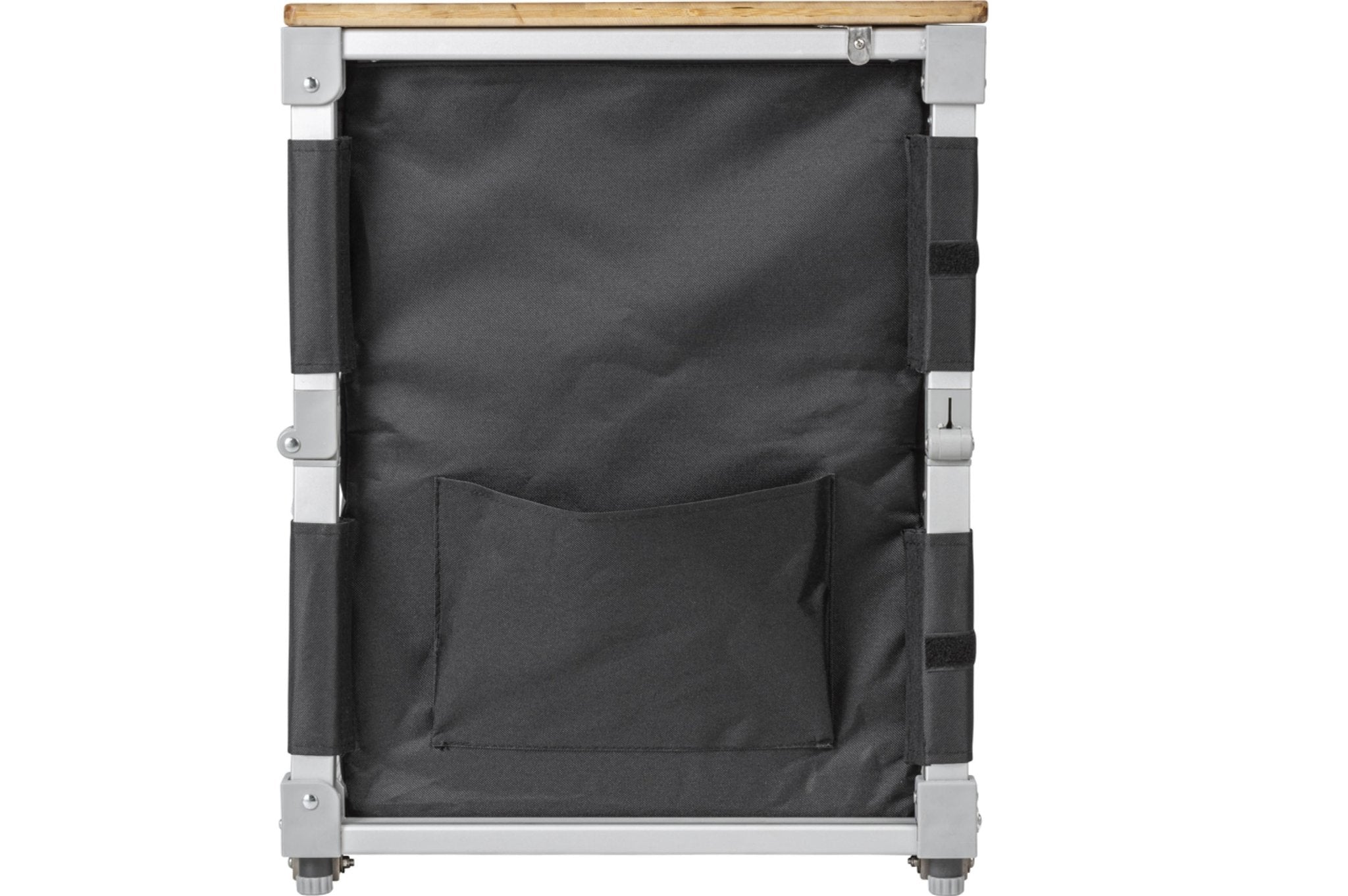 Tragbarer, klappbarer Küchenschrank mit völlig neuer, platzsparender Mountless-Aluminiumkonstruktion. Im Handumdrehen zu öffnen und zu schließen. Kochfläche aus Bambusholz. Komplett mit Stoffschrank zur Aufbewahrung des gesamten Kochzubehörs. Im zusammengeklappten Zustand sehr kompakt verstaubar und daher ideal für alle Kleinbusse, Vans und Wohnmobile. Komplett mit Aufbewahrungstasche.