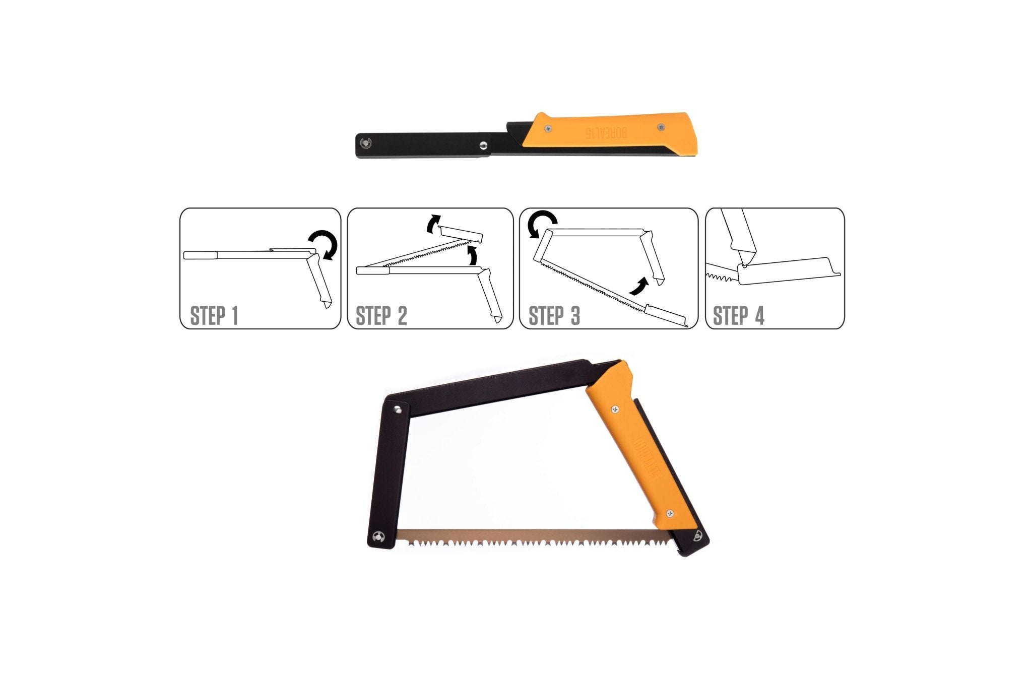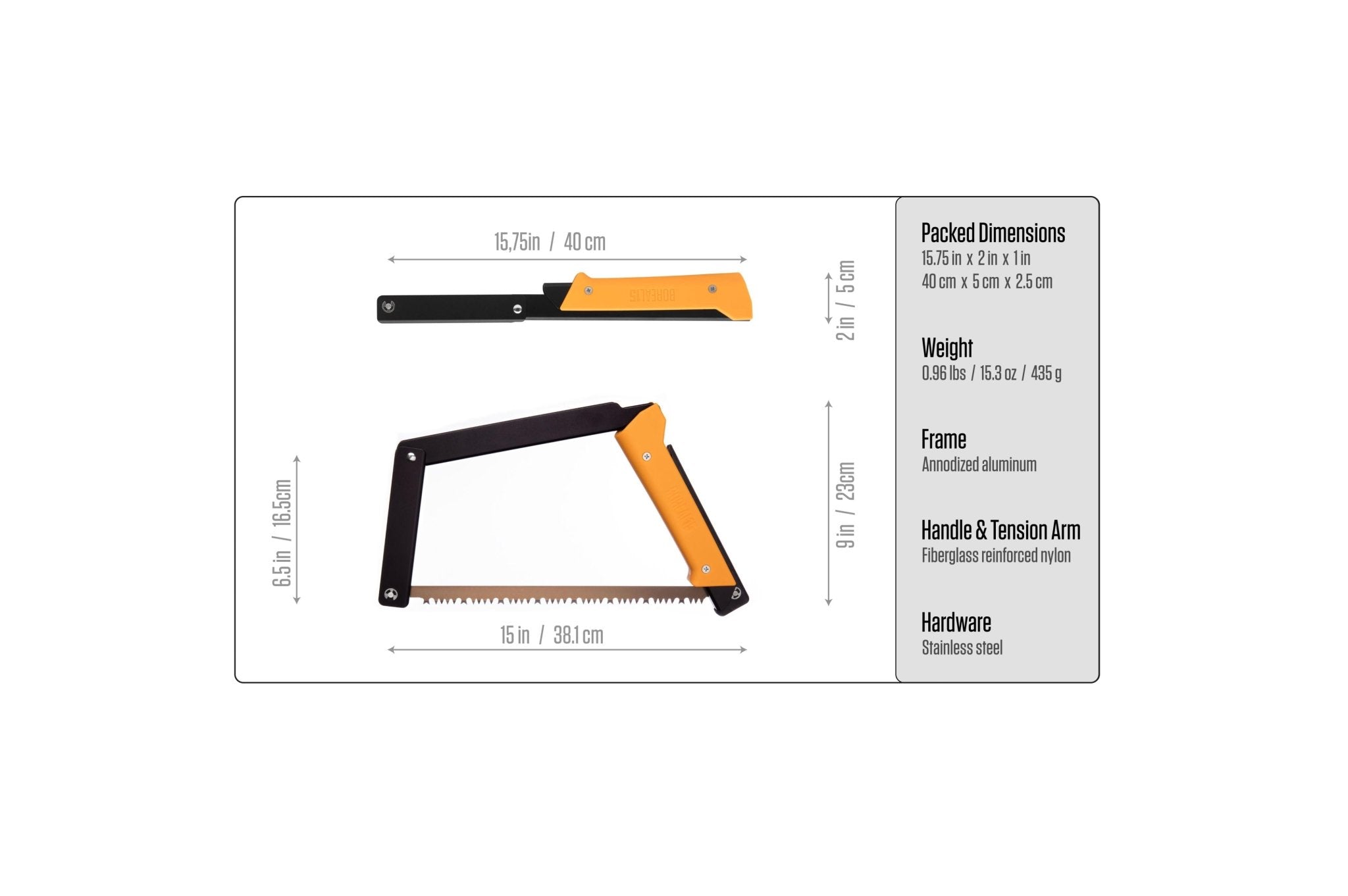 Öffnet in Sekundenschnelle mit einer simplen Bewegung - da es sich um eine verbundene Baugruppe handelt Das Spannen der Klinge erfolgt als Teil des Setups, ist reproduzierbar und so eingestellt, dass eine optimale Sägeleistung erzielt wird Das Sägeblatt muss beim Öffnen und Schliessen nicht berührt werden. Die Sägezähne sind eingeklappt vollständig verborgen. Dies schützt dich und deine Ausrüstung. Einfacher und schneller Klingenwechsel - kein Spezialwerkzeug erforderlich Der Griffwinkel wurde entwickelt, um die Hubkraft gegenüber dem Gleichgewicht der Sägen zu optimieren Der Griff ist ergonomisch gestaltet und bietet maximalen Komfort Griffmaterial aus strapazierfähigem und wetterbeständigem Nylon Rahmen aus hochfestem extrudiertem und eloxiertem Aluminium (kein Verdrehen). Verbund mit Edelstahlbeschlägen