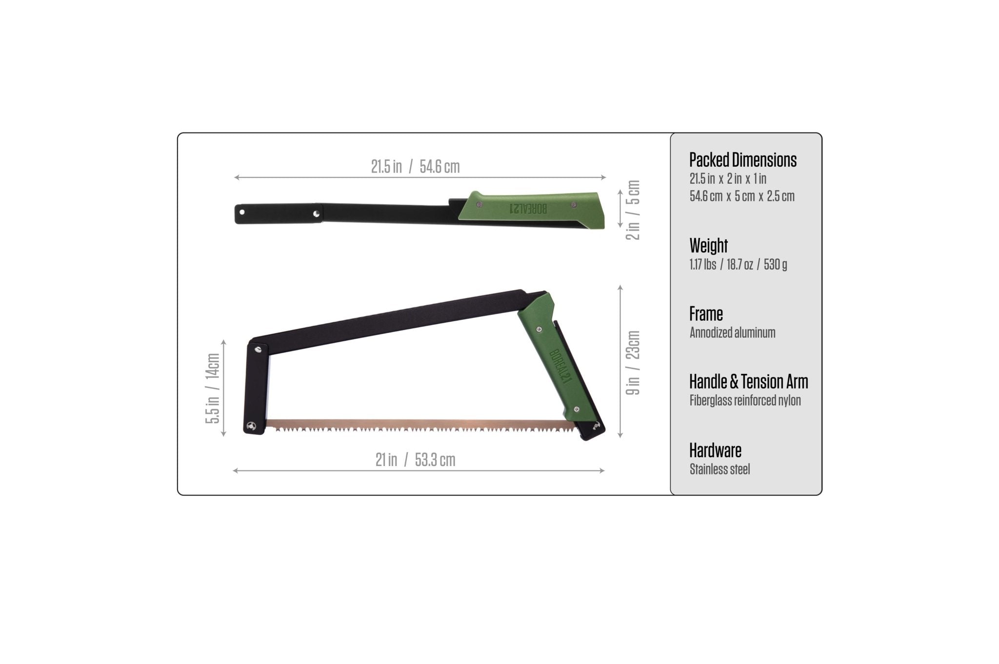 Öffnet in Sekundenschnelle mit einer simplen Bewegung - da es sich um eine verbundene Baugruppe handelt Das Spannen der Klinge erfolgt als Teil des Setups, ist reproduzierbar und so eingestellt, dass eine optimale Sägeleistung erzielt wird Das Sägeblatt muss beim Öffnen und Schliessen nicht berührt werden. Die Sägezähne sind eingeklappt vollständig verborgen. Dies schützt dich und deine Ausrüstung. Einfacher und schneller Klingenwechsel - kein Spezialwerkzeug erforderlich Der Griffwinkel wurde entwickelt, um die Hubkraft gegenüber dem Gleichgewicht der Sägen zu optimieren Der Griff ist ergonomisch gestaltet und bietet maximalen Komfort Griffmaterial aus strapazierfähigem und wetterbeständigem Nylon Rahmen aus hochfestem extrudiertem und eloxiertem Aluminium (kein Verdrehen). Verbund mit Edelstahlbeschlägen