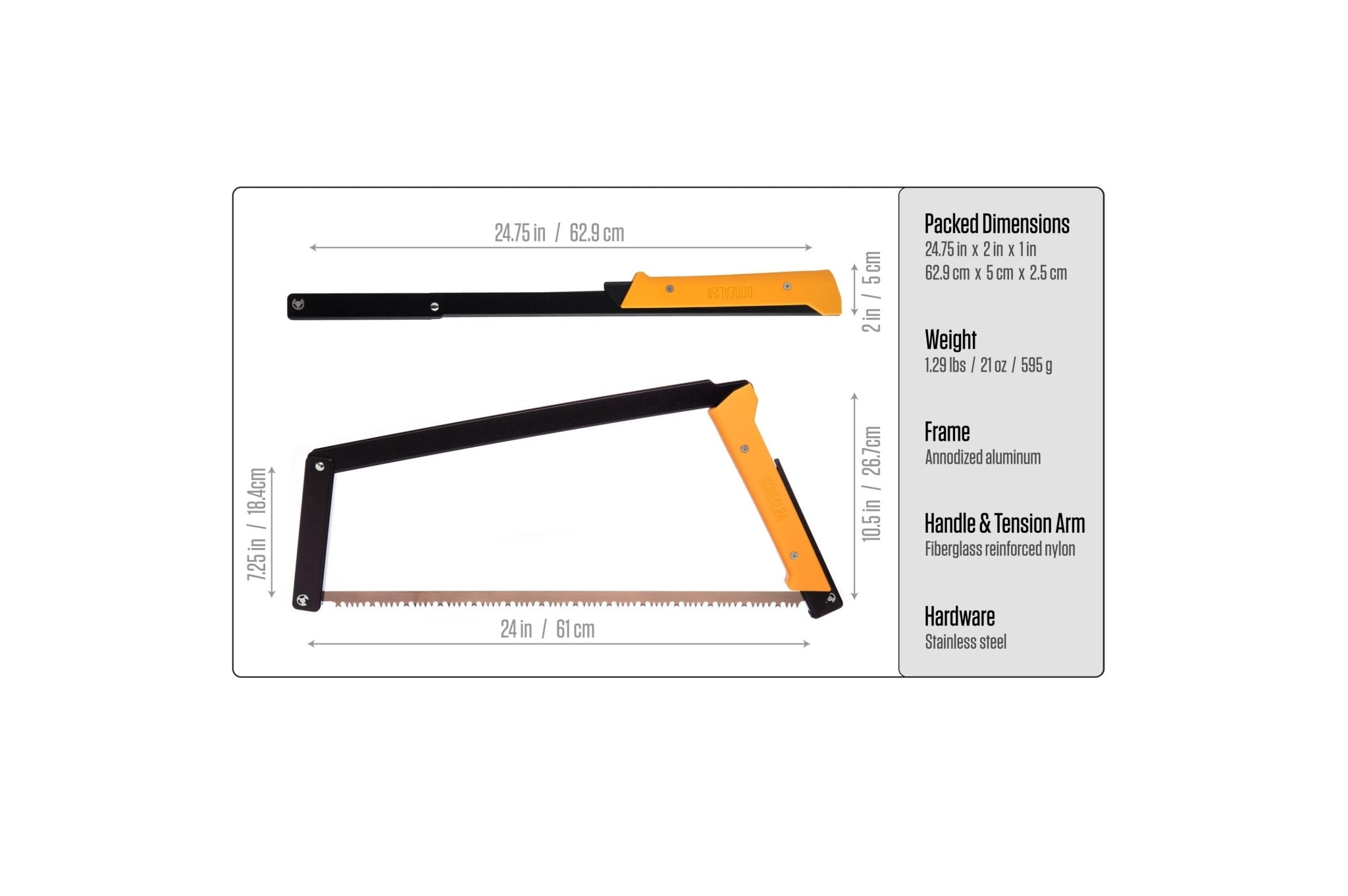 Öffnet in Sekundenschnelle mit einer simplen Bewegung - da es sich um eine verbundene Baugruppe handelt Das Spannen der Klinge erfolgt als Teil des Setups, ist reproduzierbar und so eingestellt, dass eine optimale Sägeleistung erzielt wird Das Sägeblatt muss beim Öffnen und Schliessen nicht berührt werden. Die Sägezähne sind eingeklappt vollständig verborgen. Dies schützt dich und deine Ausrüstung. Einfacher und schneller Klingenwechsel - kein Spezialwerkzeug erforderlich Der Griffwinkel wurde entwickelt, um die Hubkraft gegenüber dem Gleichgewicht der Sägen zu optimieren Der Griff ist ergonomisch gestaltet und bietet maximalen Komfort Griffmaterial aus strapazierfähigem und wetterbeständigem Nylon Rahmen aus hochfestem extrudiertem und eloxiertem Aluminium (kein Verdrehen). Verbund mit Edelstahlbeschlägen
