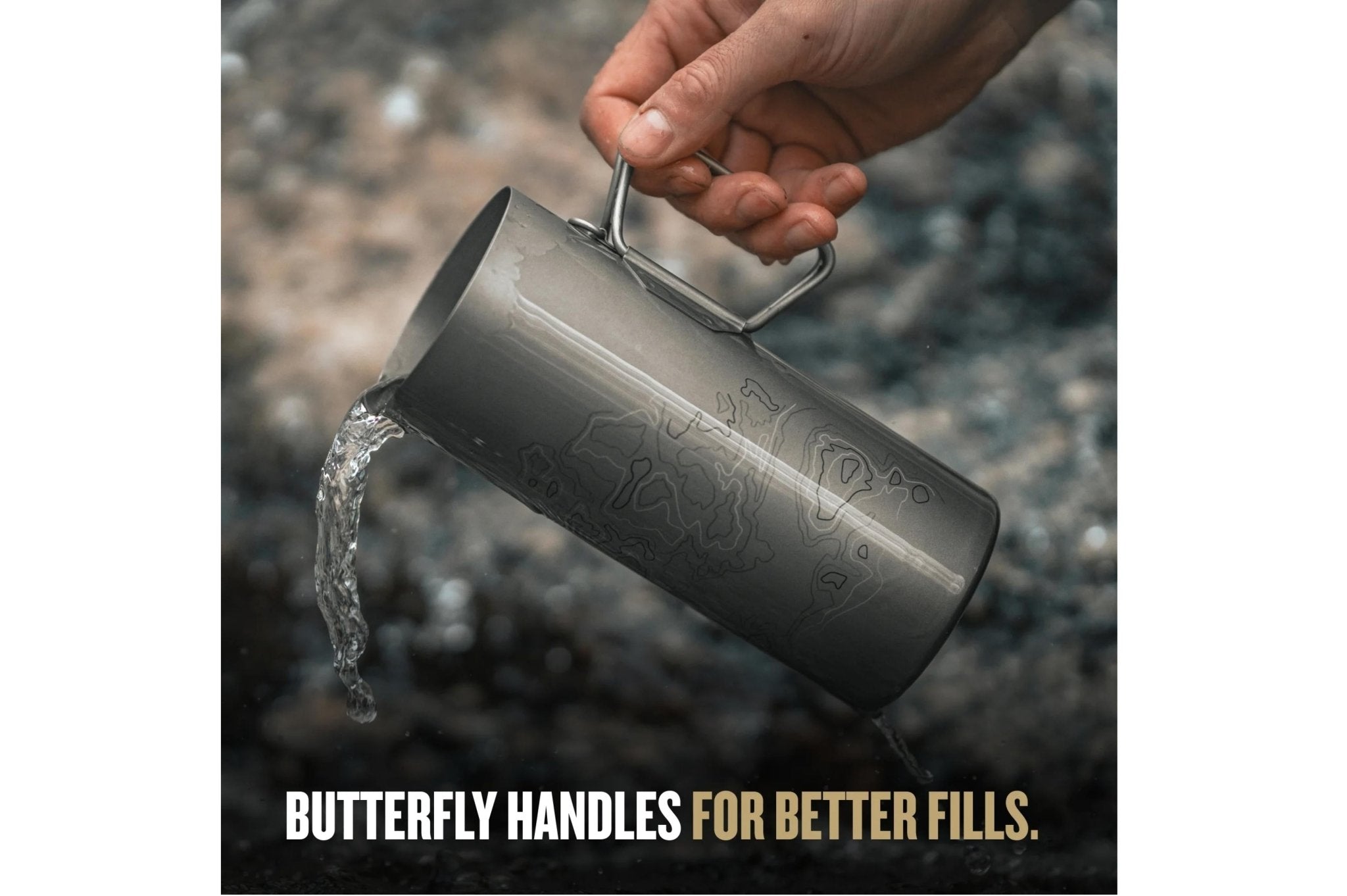 Robuste Schmetterlingsgriffe ermöglichen das Erhitzen von Wasser über heißen Kohlen oder offenem Feuer. Die Flasche verfügt über ein Einwegventil für Elektrolyte und Sportgetränke und eine Lebensdauer von 350 Zyklen.