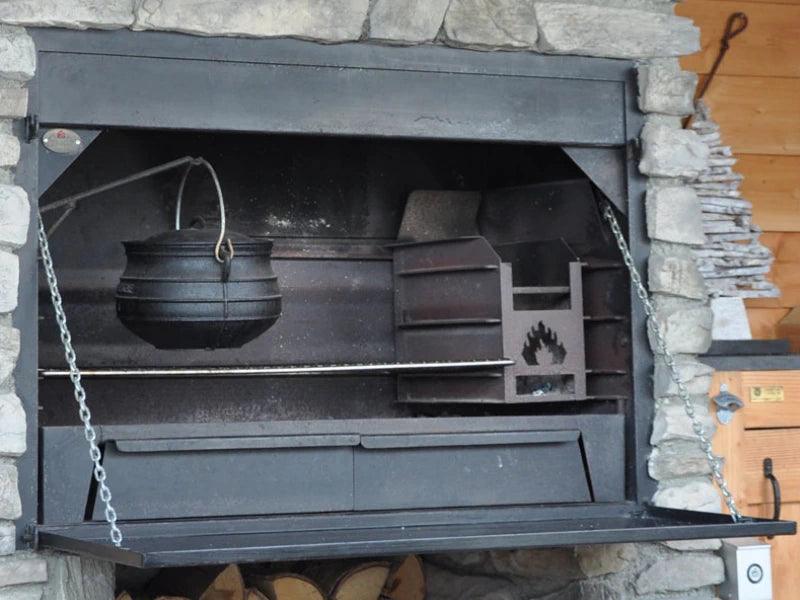 Der Home Fires Built-in Supreme de luxe 1000 verfügt serienmäßig über einen schweren Steakrost aus Edelstahl mit massiven, 8 mm starken Stäben, einen Schürhaken, einen erhöhten, herausnehmbaren Aschekasten, einschließlich Laden, und einen Halter für ein traditionelles „Potjie“ (Topf) ausgestattet. Darüber hinaus ist eine Vorrichtung zur Beleuchtung vorhanden.