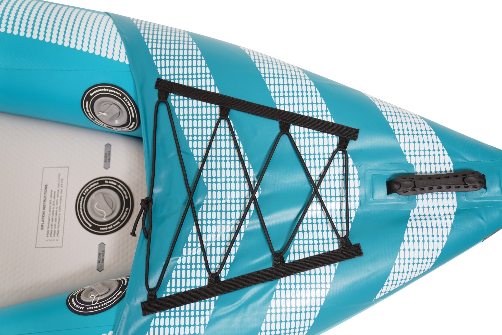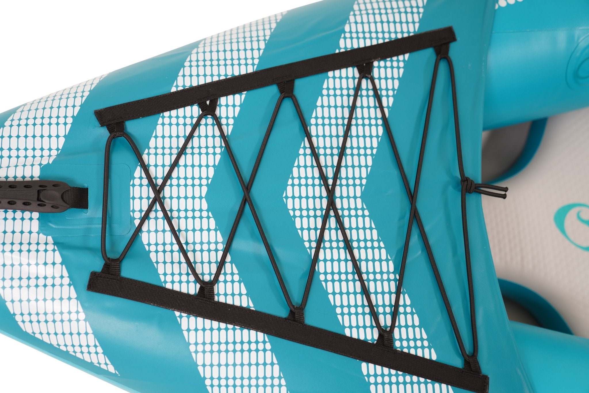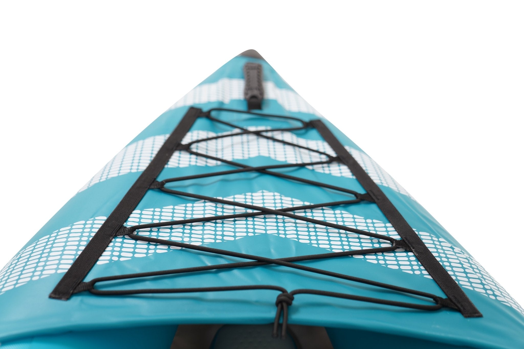 Das Hybris 500 ist ein 3-Kayak aus hochwertigen Materialien. Das Boot bietet gut Platz für drei Erwachsene. Die Siderails aus verstärktem PVC sorgen für eine hervorragende Stabilität und der Tarpaulin Boden schützt das Boot gegen Abreibung und harte Gegenstände. Die Sitzfläche besteht aus 8cm HDDS - High Density Drop Stitch Floor und sorgt für zusätzliche Stabilität. Bug wie Heck sind mit Spritzschutz ausgerüstet und bieten Platz für kleinere Gepäckstücke. Die zusätzlichen Gepäcknetze bieten zudem Platz für weiter Dinge, die schnell greifbar sein müssen. Die schlanke Form des Bootes mit einer Breite von 90 cm ermöglichen ein flüssiges vorwärtskommen. Die 2 Finnen des Hybris 500 sorgen zudem für einen hervoragenden Geradeauslauf. Das Hybris ist die ideale Wahl für den Weekend-Ausflug oder die längere Tour auf Seen und ruhigen Flüssen. Der mitgelieferten Sitze und die Stautasche sind hochwertig gemacht. Ein geeignetes Paddel muss seperat ausgesucht werden und ist nicht im Lieferumfang enthalten.