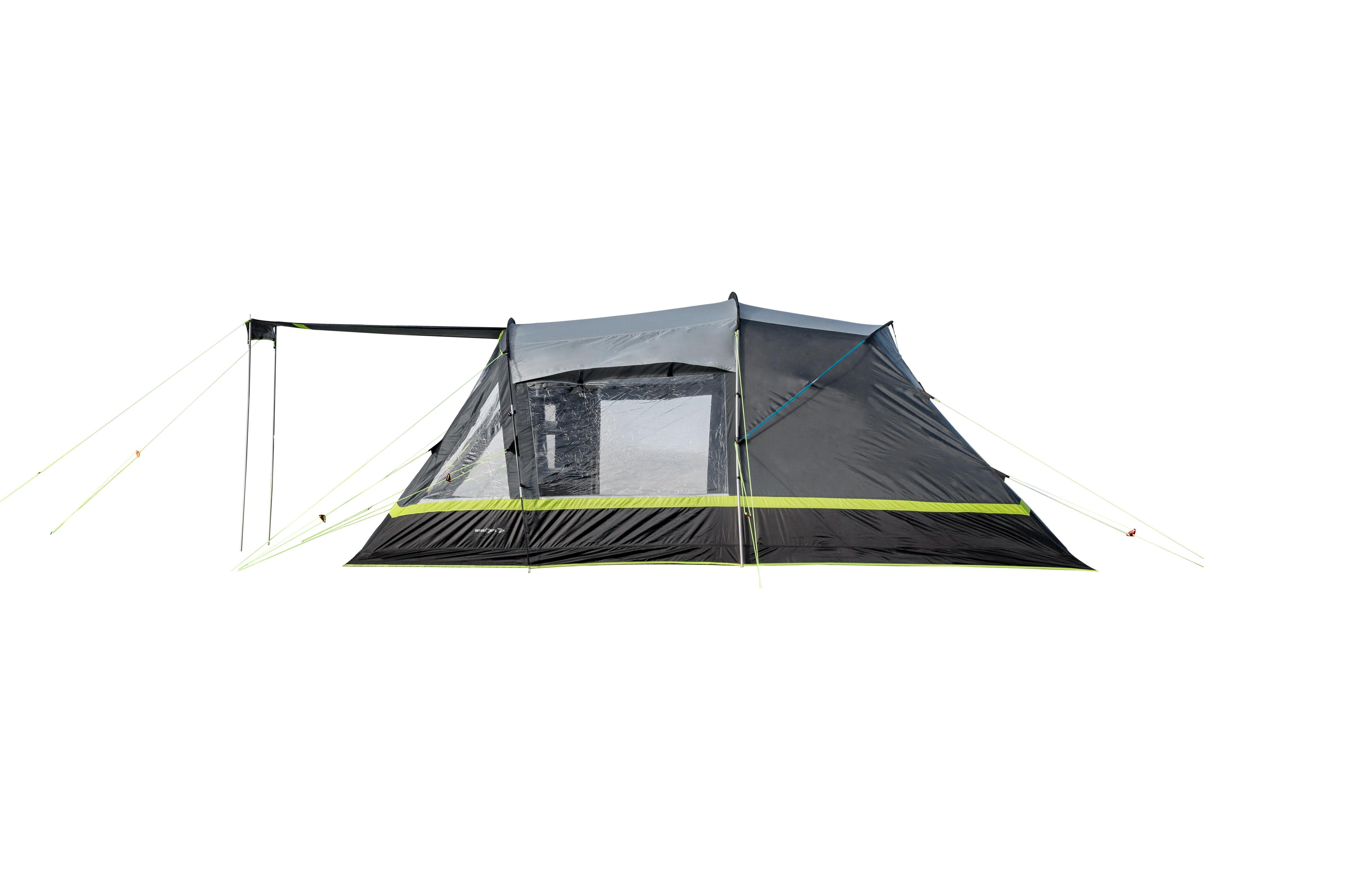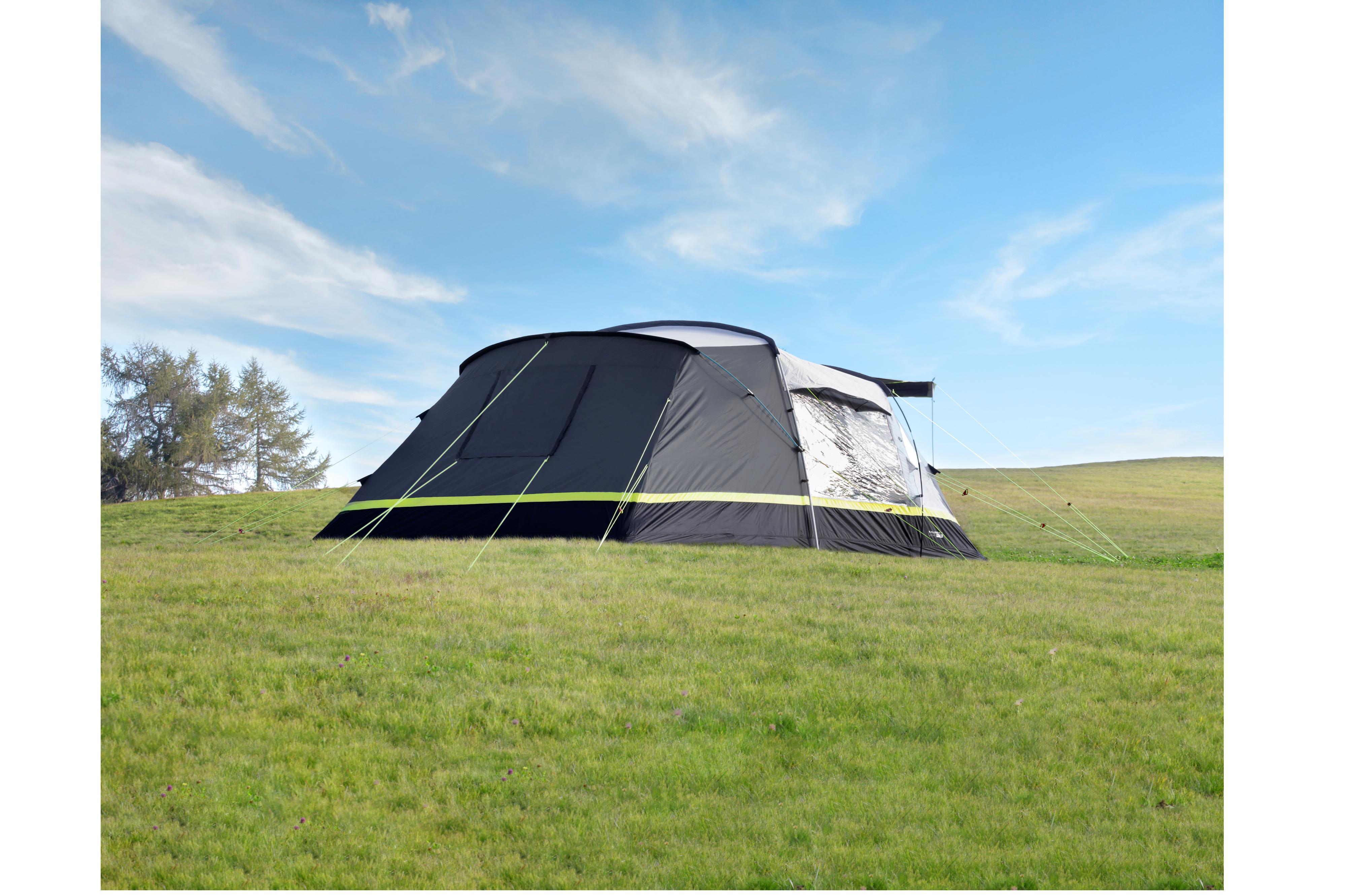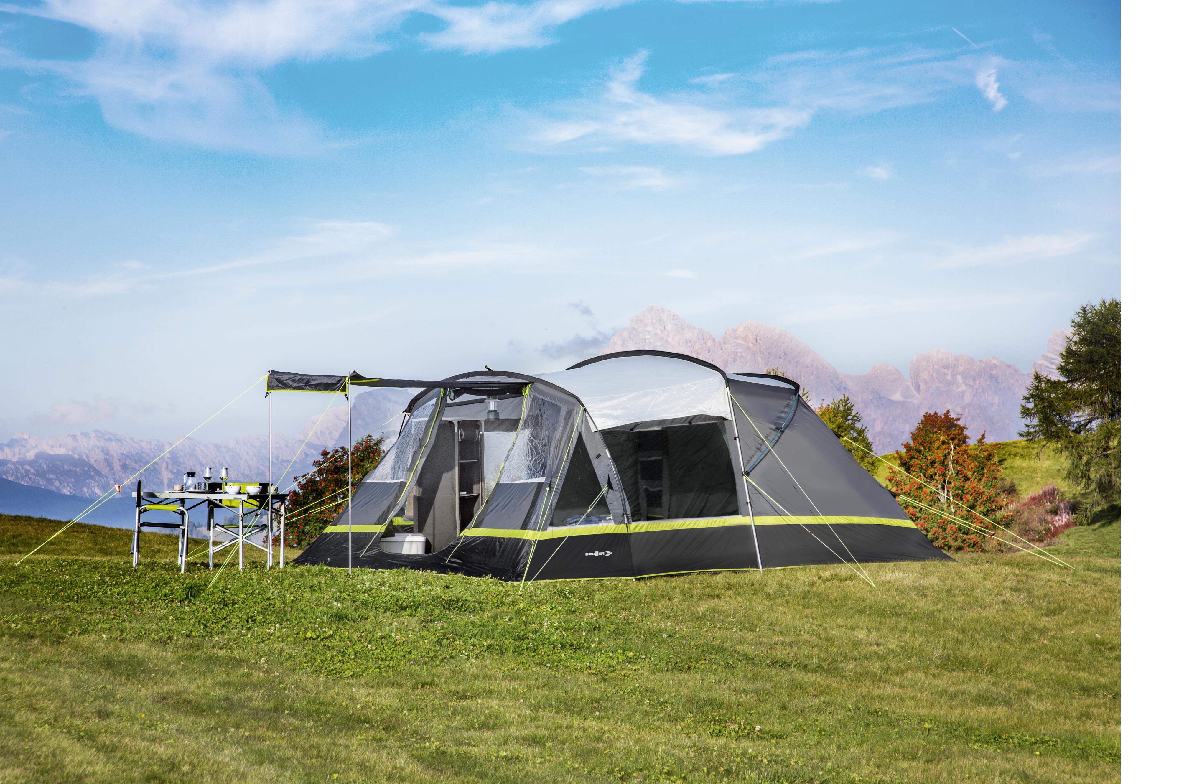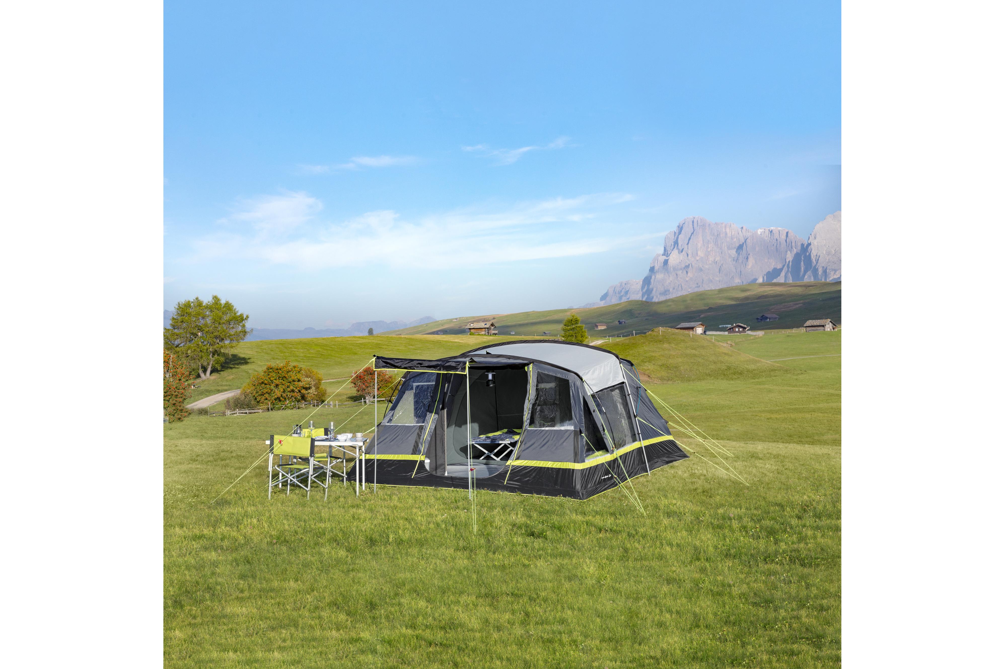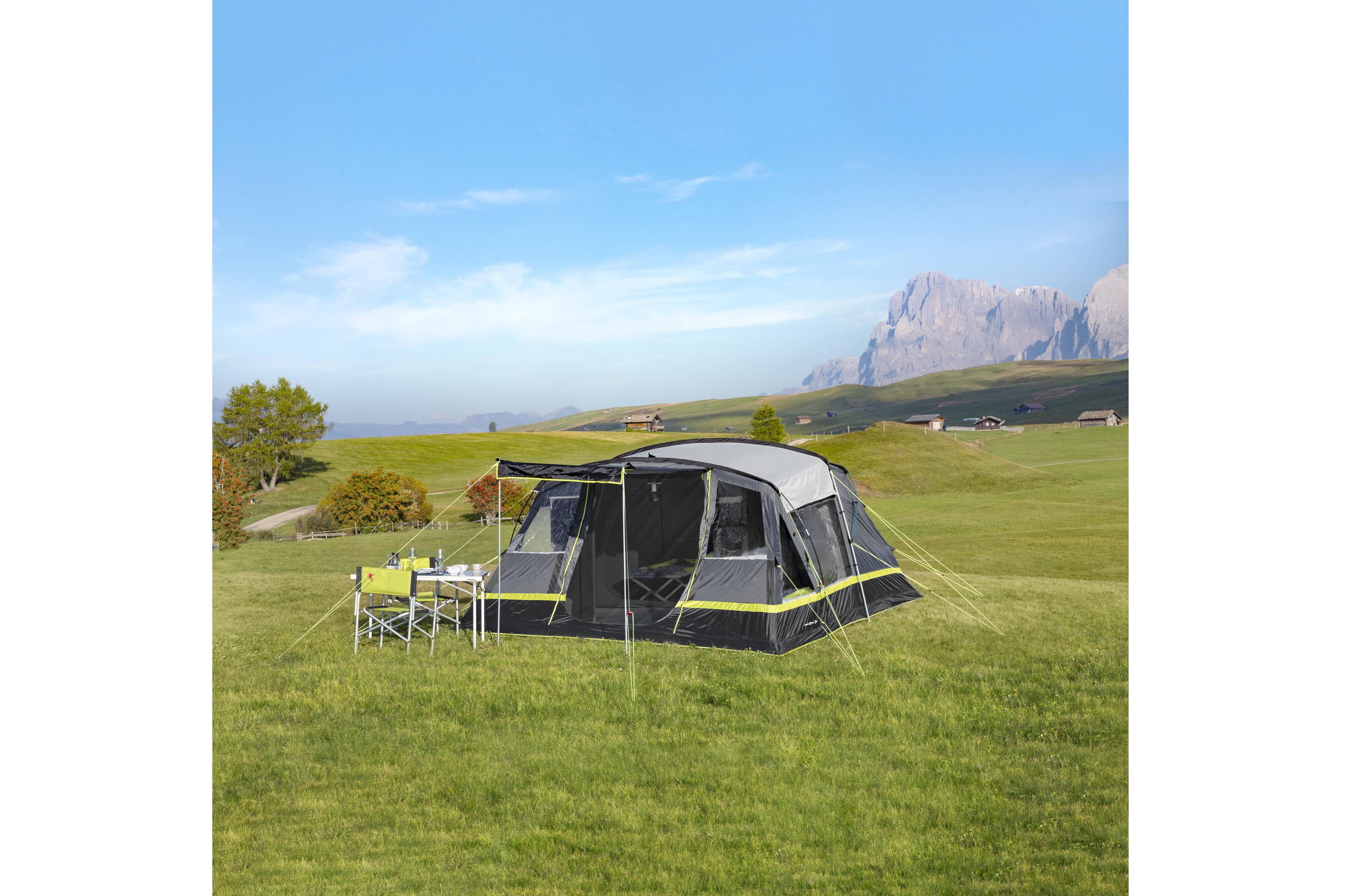 Eine vollständig eingenähte Bodenwanne aus robustem PE-Material schützt vor Feuchtigkeit und Schmutz und sorgt für eine trockene, komfortable Umgebung. Der Eingang führt in den geräumigen Wohnbereich, während zwei getrennte Schlafkabinen Privatsphäre bieten. Panoramafenster lassen viel Licht herein und bieten einen tollen Blick auf die Natur.