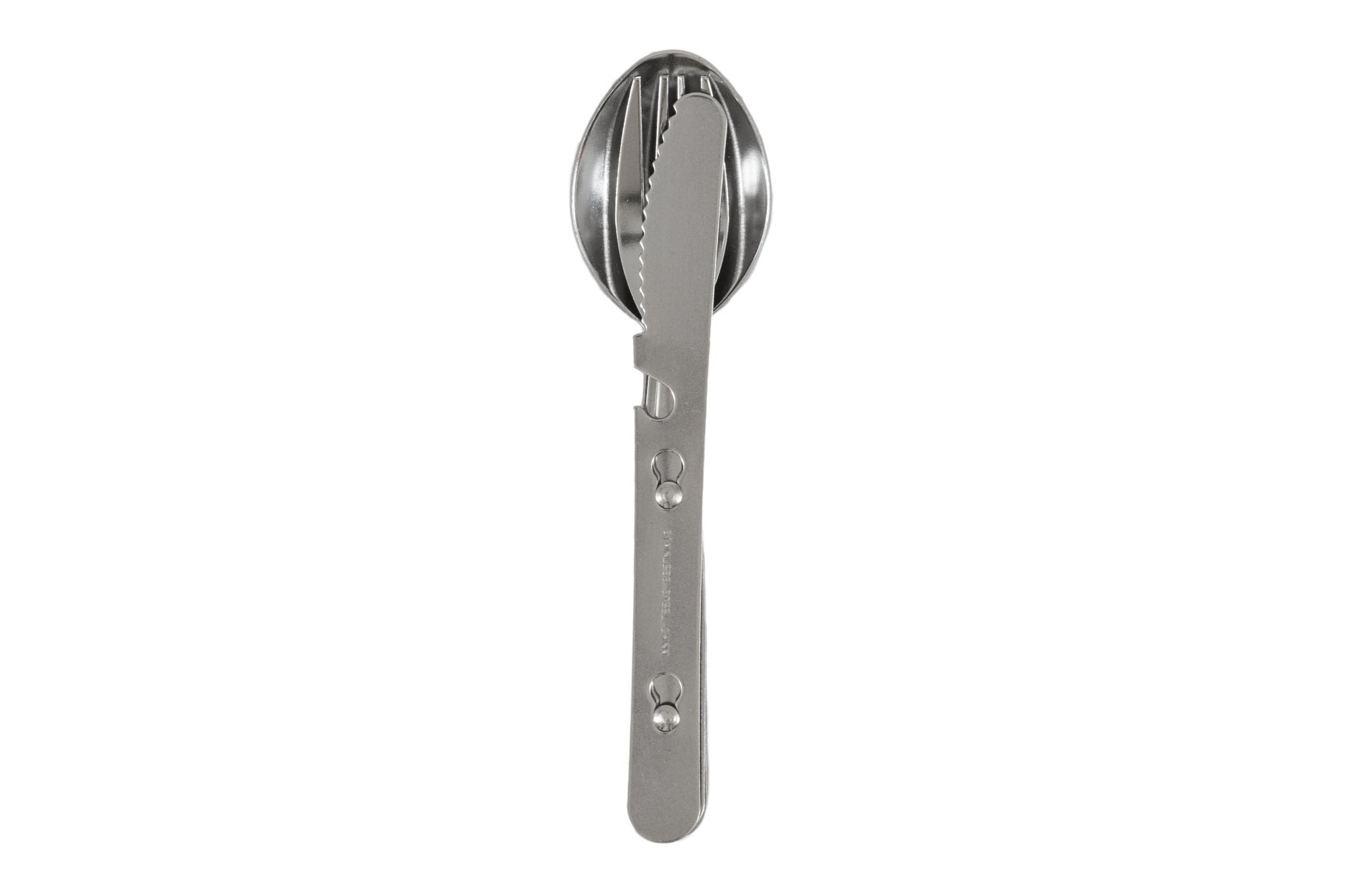 Ein kompaktes Messer-, Gabel- und Löffelset. Unser Messer-, Gabel- und Löffelset ist aus robustem Edelstahl gefertigt, der langlebig und leicht zu reinigen ist, so dass es Ihnen jahrelang beim Camping zur Verfügung stehen wird. Die drei Teile lassen sich mit einem Clip zusammenstecken und in einem Plastikbeutel verstauen oder am Gürtel befestigen. Mit dem integrierten Flaschenöffner sind Sie für jede Gelegenheit gerüstet.