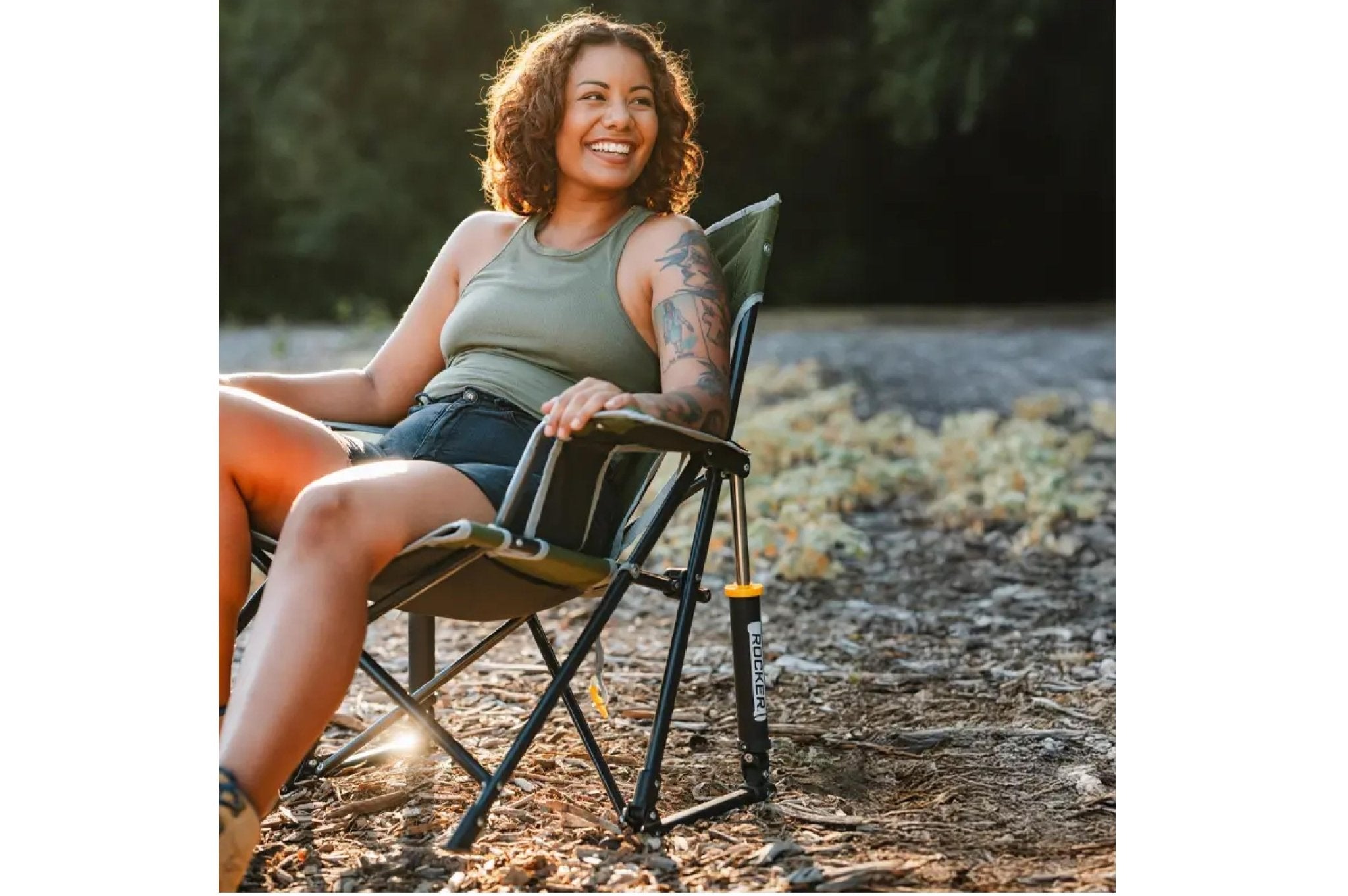 Schaukelstuhl für draußen: Der Kickback Rocker mit Tragegurt. Du suchst nach einem Schaukelstuhl für draußen, der dir sowohl Komfort als auch Mobilität bietet? Dann ist der Kickback Rocker genau der Richtige für dich. Der Kickback Rocker ist ein mittelgroßer Schaukelstuhl, der etwas niedriger als normale Stühle, aber höher als bodennahe Stühle sitzt. Das macht ihn zum perfekten Stuhl zum Zurücklehnen und Entspannen. Er verfügt über die patentierte Spring-Action Rocking Technology™, die dir ein sanftes Schaukelerlebnis auf flachen, harten und weichen Untergründen ermöglicht. Außerdem ist er als taschenloser Stuhl konzipiert und hat einen integrierten Tragegurt und ein Schlaufen- und Stiftverschlusssystem. So kannst du ihn schnell und einfach auf- und abbauen. Weitere Merkmale sind ein Getränkehalter und eine Handytasche, die dir noch mehr Komfort bieten.