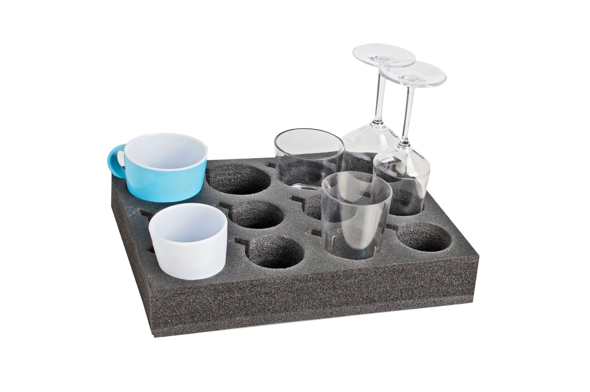 Glas und Tassenhalter aus weichem Kunststoff. 12 Einzelhalterungen verschiedener Grösse mit Henkelausspahrung.