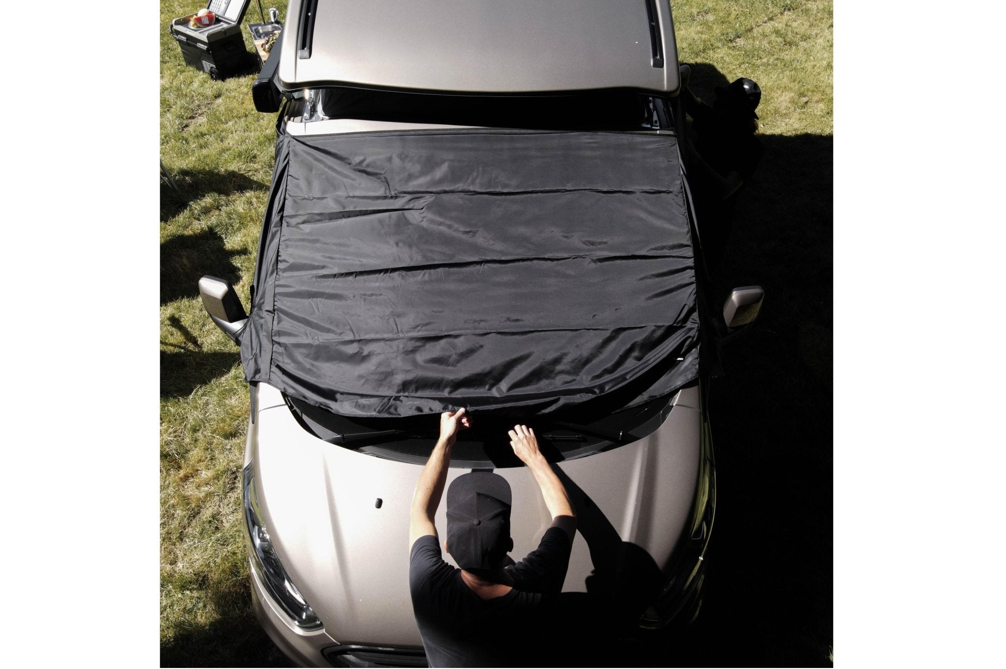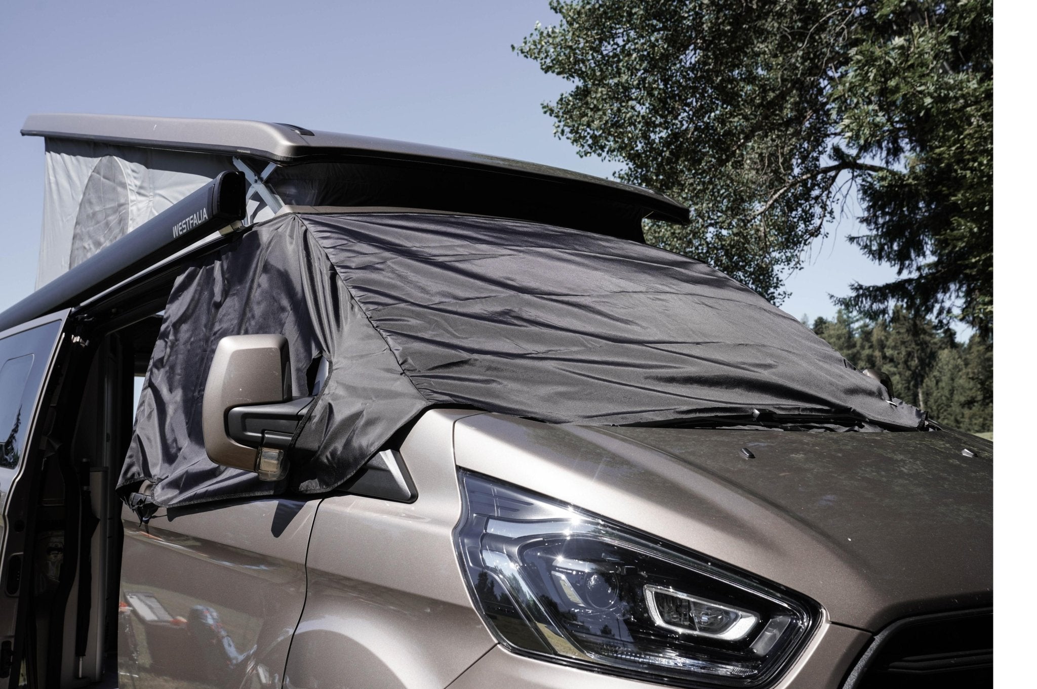 Das Shelter Light ist eine einfach Cockpitabdeckung für den Ford Tourneo Custom und Nugget. Durch das geringe Gewicht und dem kleinen Packmaß ist es optimal für den Campingeinsatz. Die Befestigung ist sturmsicher und das Gewebe trocknet nach einem Regen schnell wieder ab. Die Cockpitabdeckung verkleidet die Frontscheibe und die beiden Seitenscheiben. Zur zusätzlichen Sicherung wird das Shelter leicht unter die Scheibenwischblätter gelegt. An den Türgriffen kann das Shelter zusätzlich befestigt werden.