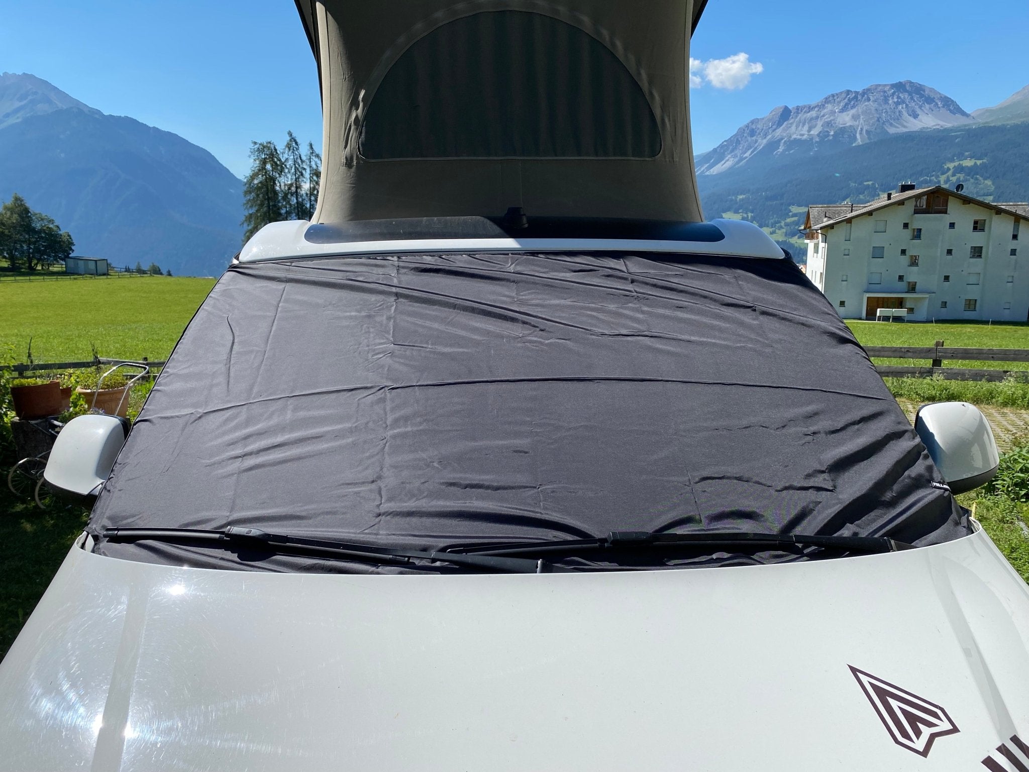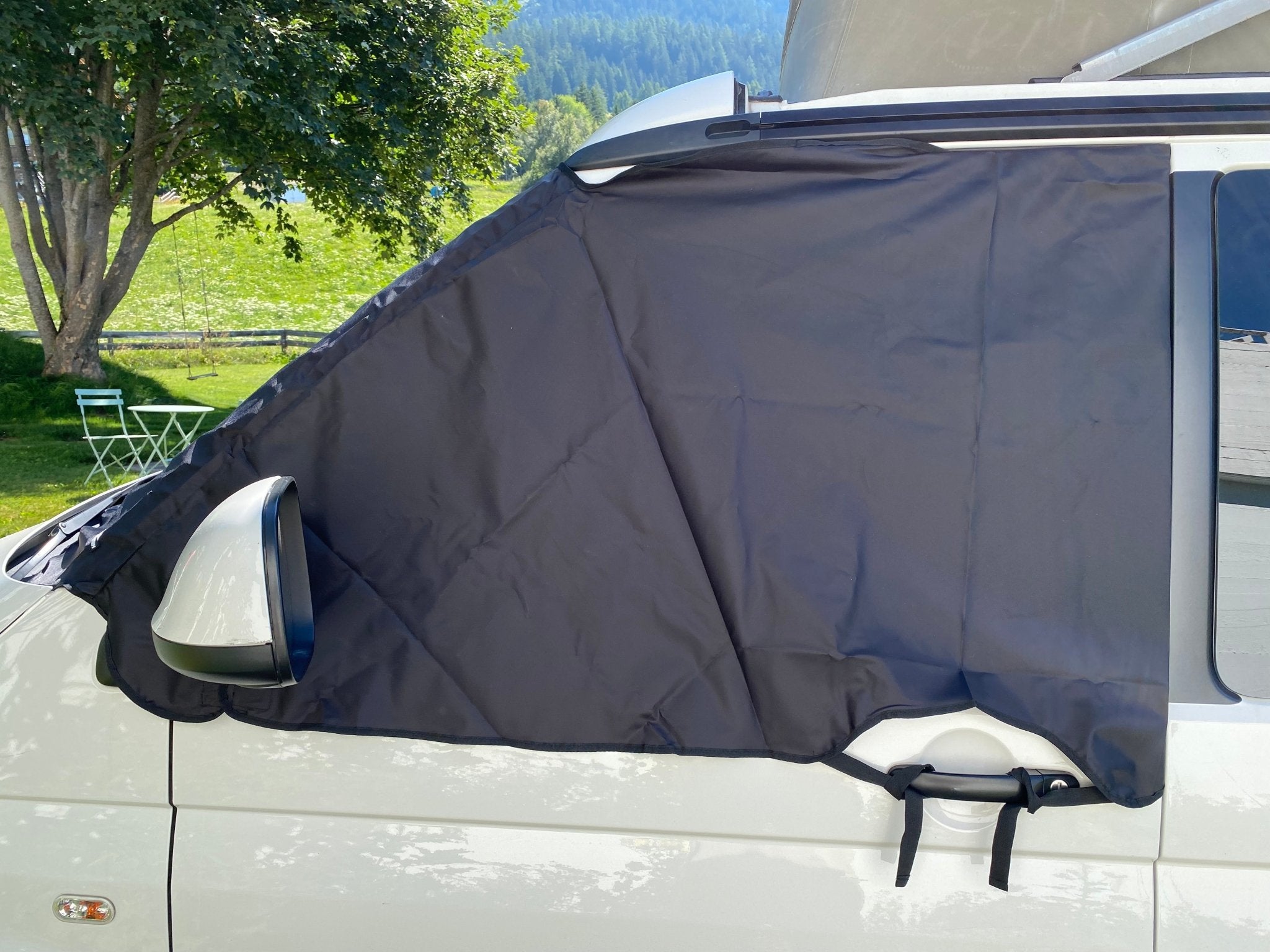 Das Shelter Light ist eine einfach Cockpitabdeckung für die Modelle VW California, Multivan und Transporter. Durch das geringe Gewicht und dem kleinen Packmaß ist es optimal für den Campingeinsatz. Die Befestigung ist sturmsicher und das Gewebe trocknet nach einem Regen schnell wieder ab. Die Cockpitabdeckung verkleidet die Frontscheibe und die beiden Seitenscheiben. Zur zusätzlichen Sicherung wird das Shelter leicht unter die Scheibenwischblätter gelegt. An den Türgriffen kann das Shelter zusätzlich befestigt werden.