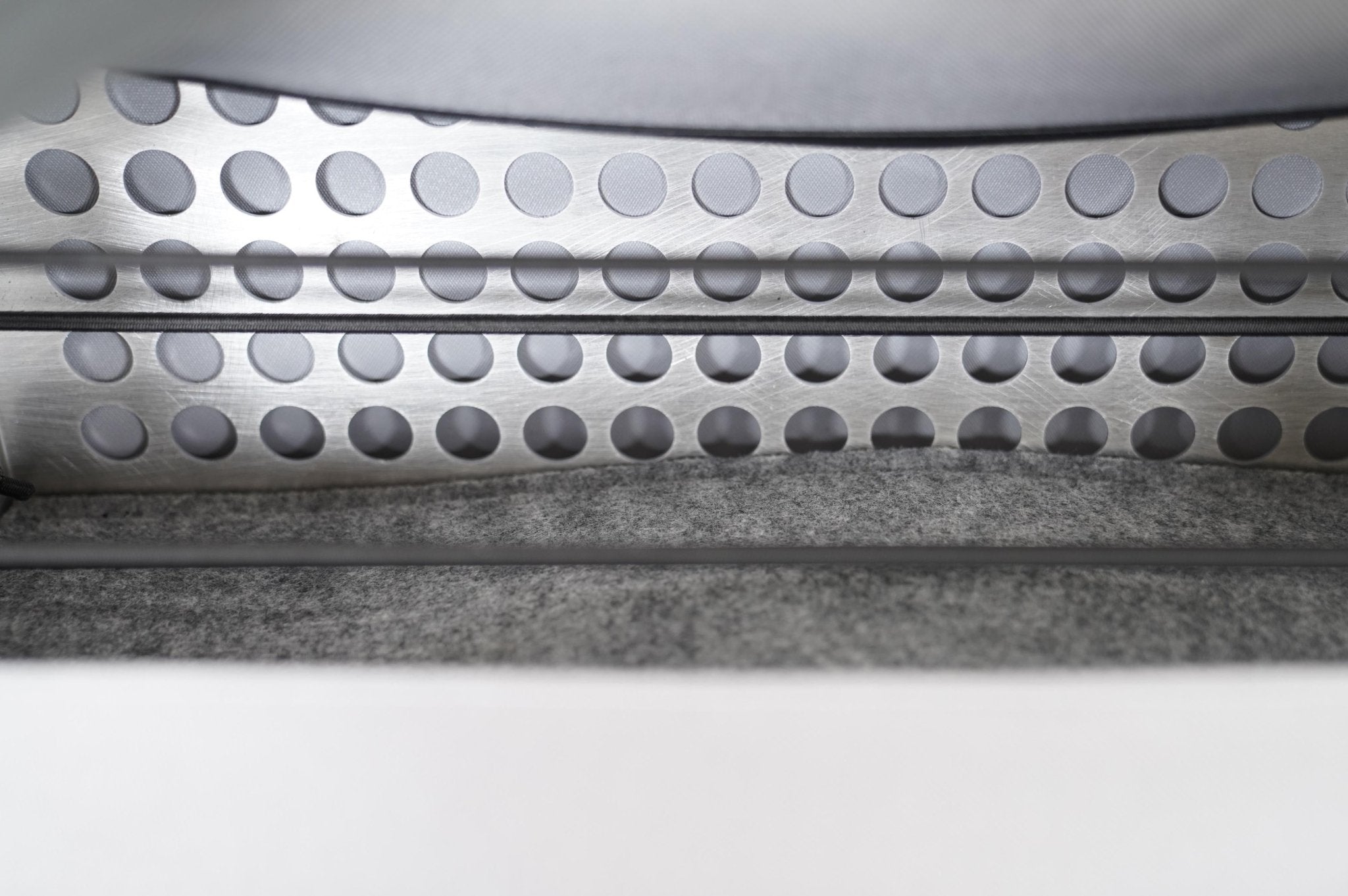 Der Regalhalter ist extrem zurückgenommen und hat keine scharfen Metallkanten, alle Ecken wurden abgerundet. EPDM-Puffer schützen den VAN vor Kratzern und sorgen dafür, dass das Regal auch bei geöffnetem Dach nicht verrutschen kann.