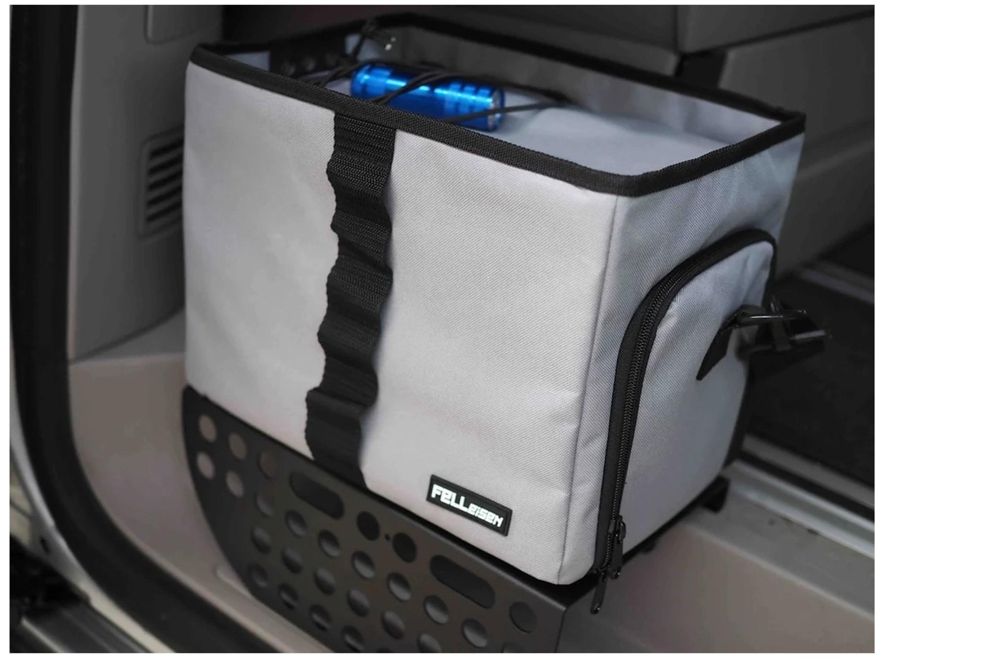 Das Stuva besteht aus einer Textiltasche, die einfach auf einen Alubody geklickt wird. Diese Tasche optimiert den Raum und sorgt dafür, dass während der Fahrt nichts aus dem Regal rutscht. Magnetisch-mechanische Verschlüsse ermöglichen ein komfortables Ein- und Ausklicken der Tasche, was die Mobilität erhöht und den Transport erleichtert. Ein Schultergurt sorgt zusätzlich für bequemen Transport, während vier Gummifüße an der Unterseite für einen sicheren Stand sorgen.