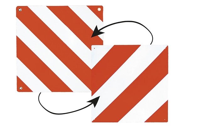 In Italien und Spanien müssen überstehende Ladungen an Fahrzeugen wie z.B. Fahrradträger mit einer Warntafel gekennzeichnet werden. Mit dieser Warntafel haben Sie für beide Länder immer die richtige Tafel dabei. Einfach drehen und Sie können die Länder wechseln.